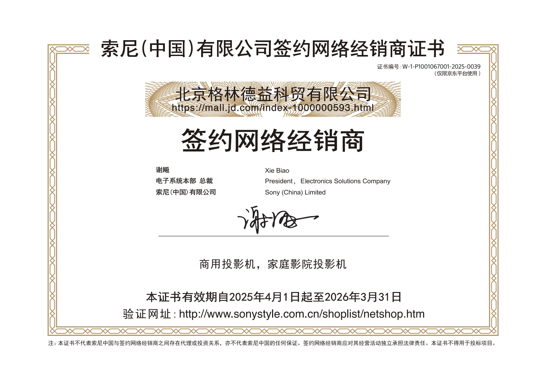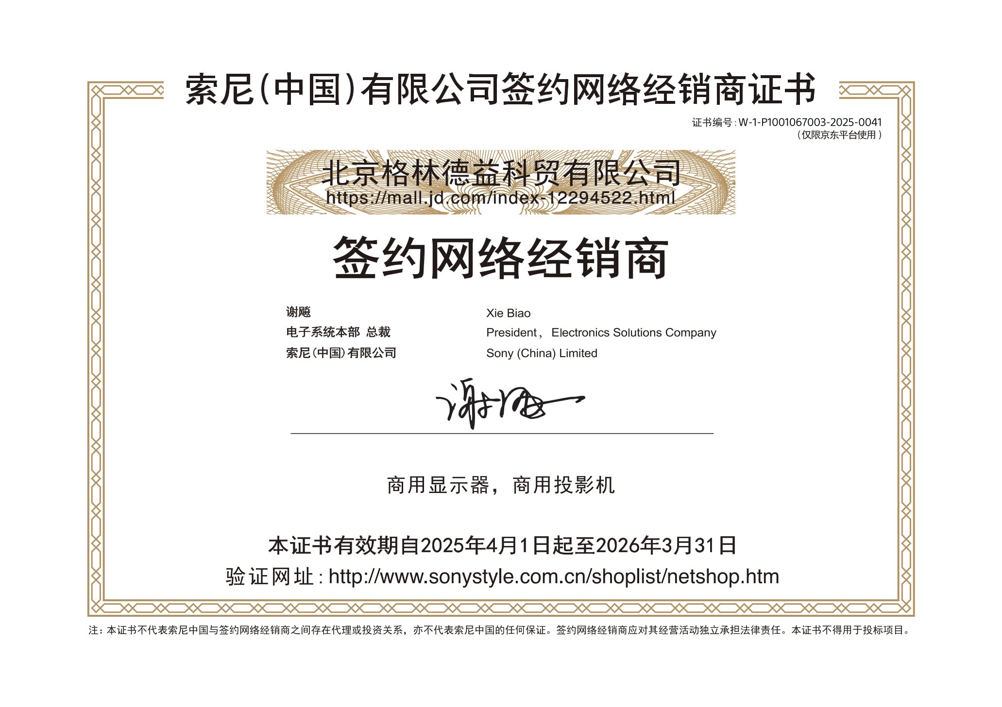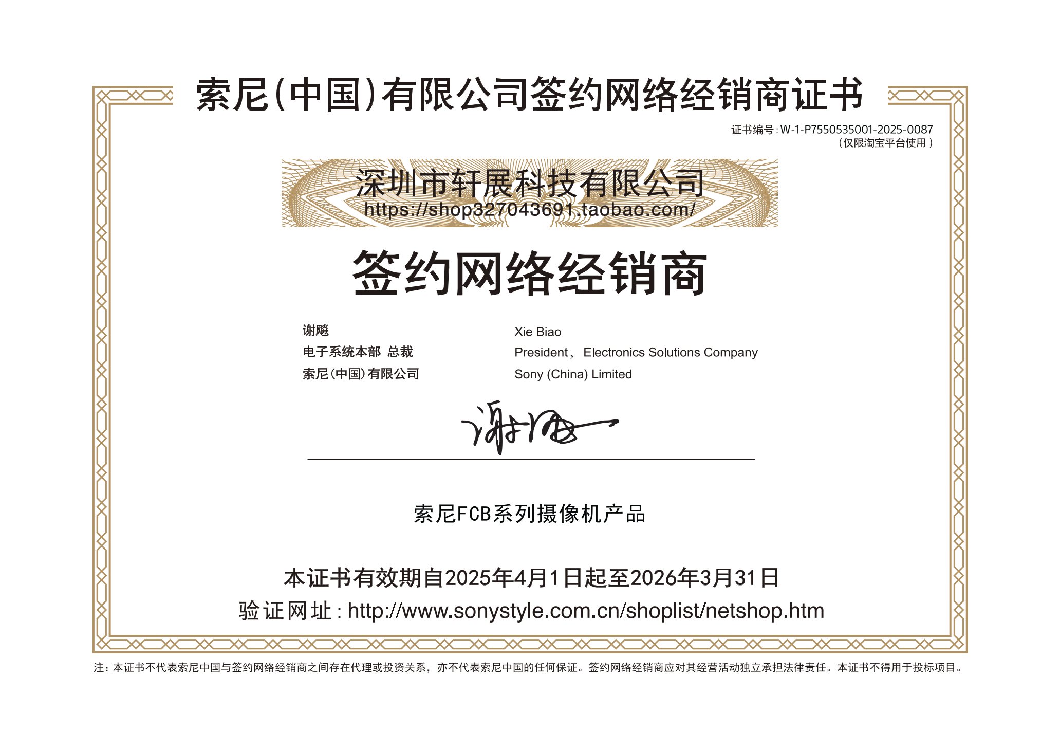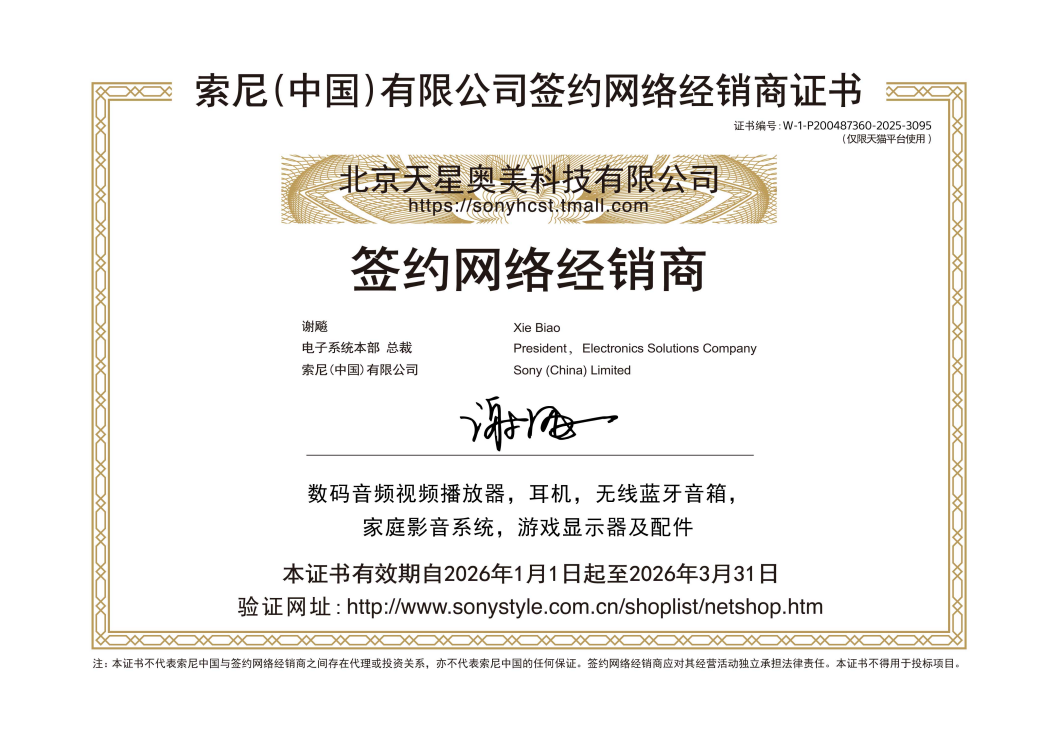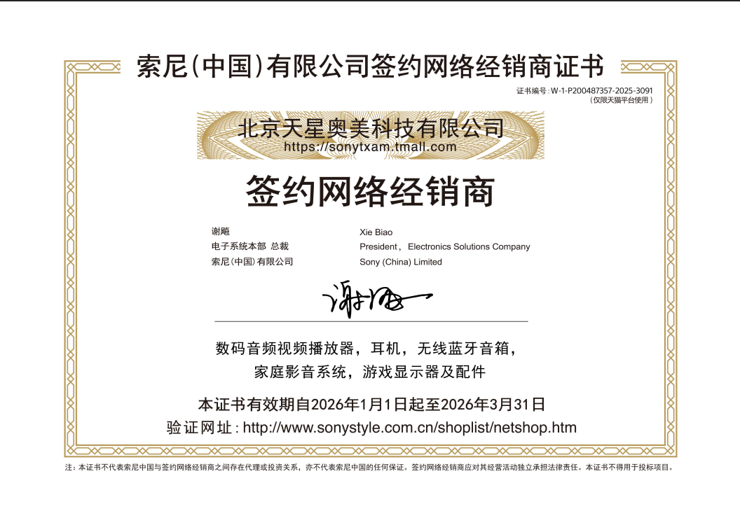 | 北京天星奥美科技有限公司 | W-1-P200487360-2025-3095 | 天猫 | https://sonyhcst.tmall.com | 查看证书收起证书 |