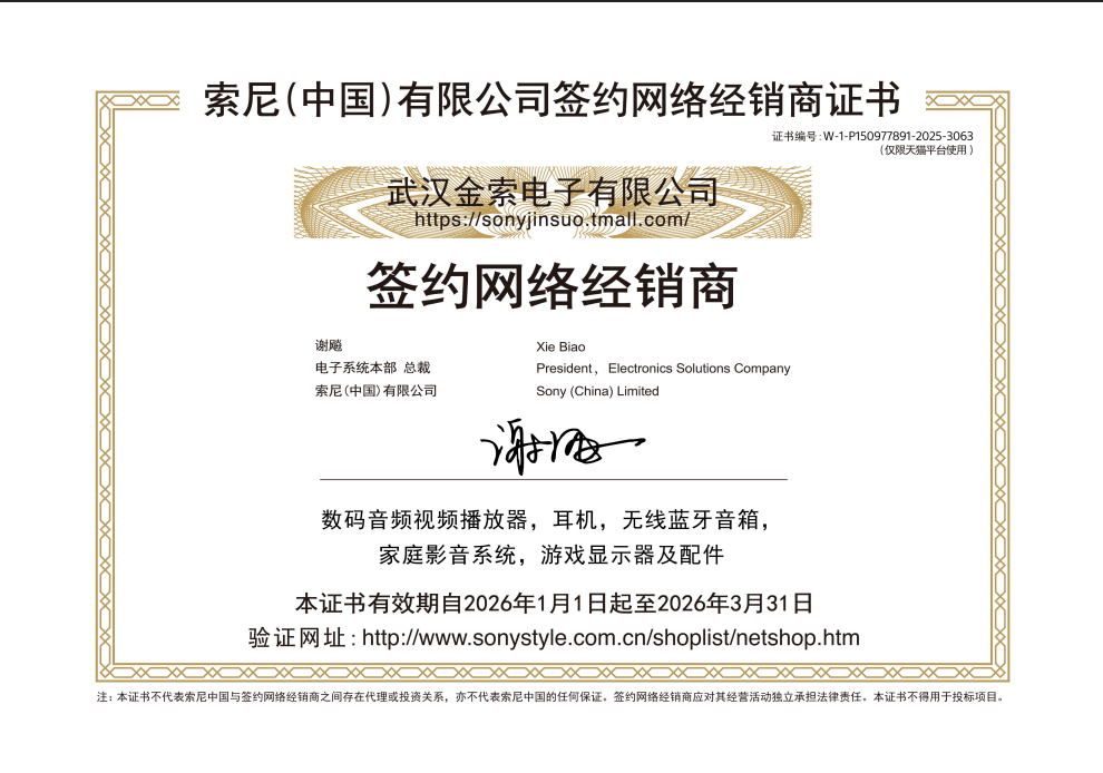 | 武汉金索电子有限公司 | W-1-P150977891-2025-3063 | 天猫 | https://sonyjinsuo.tmall.com/ | 查看证书收起证书 |