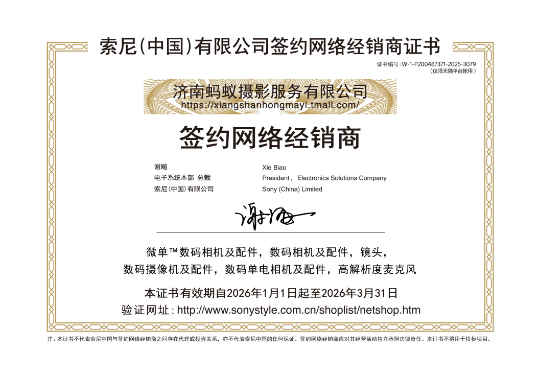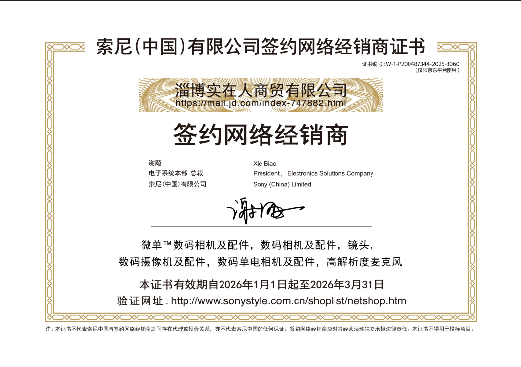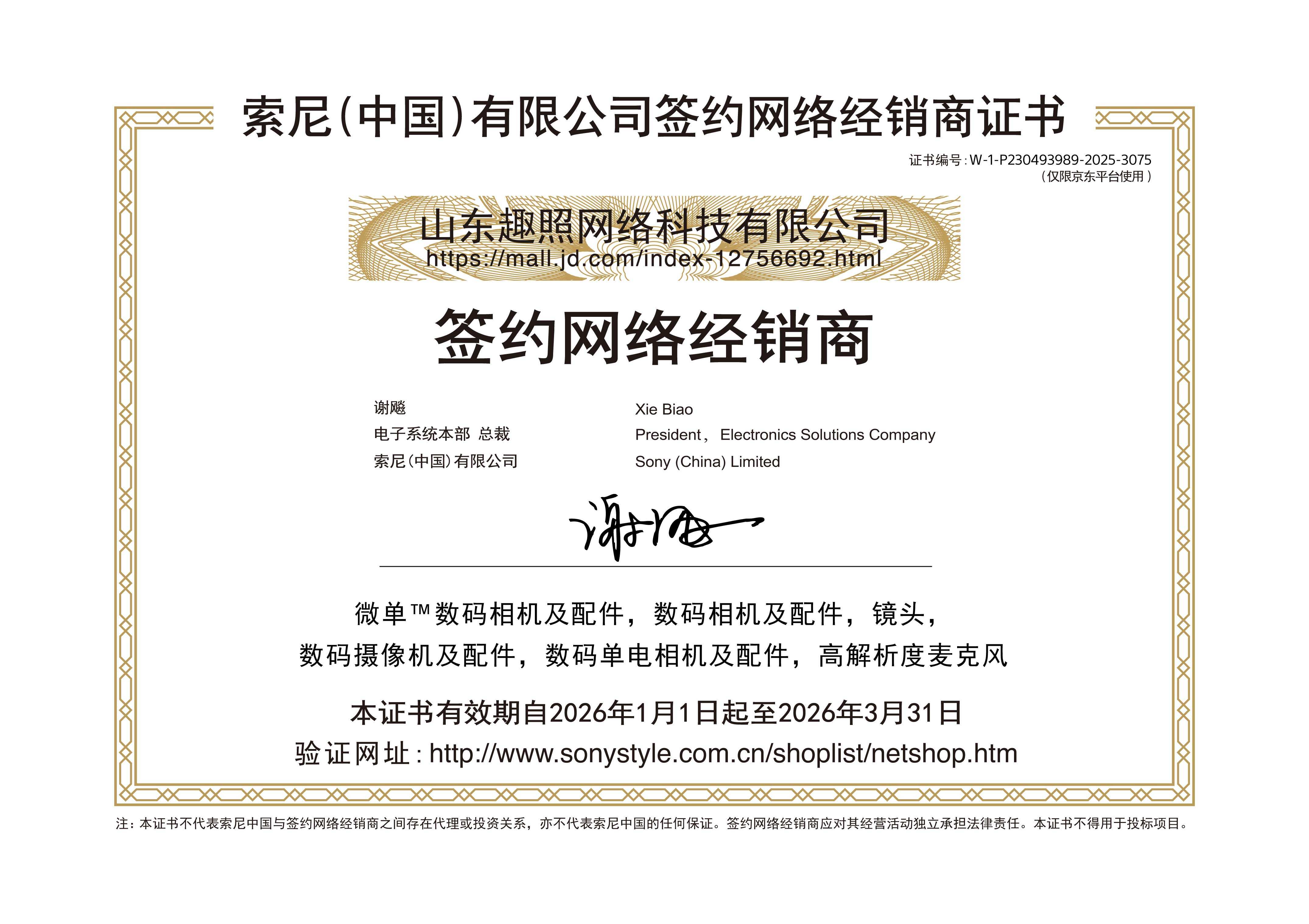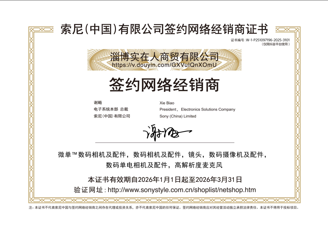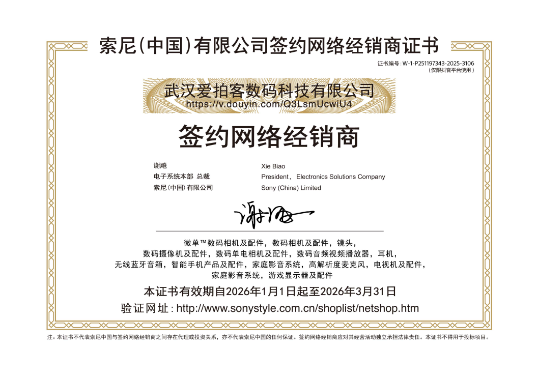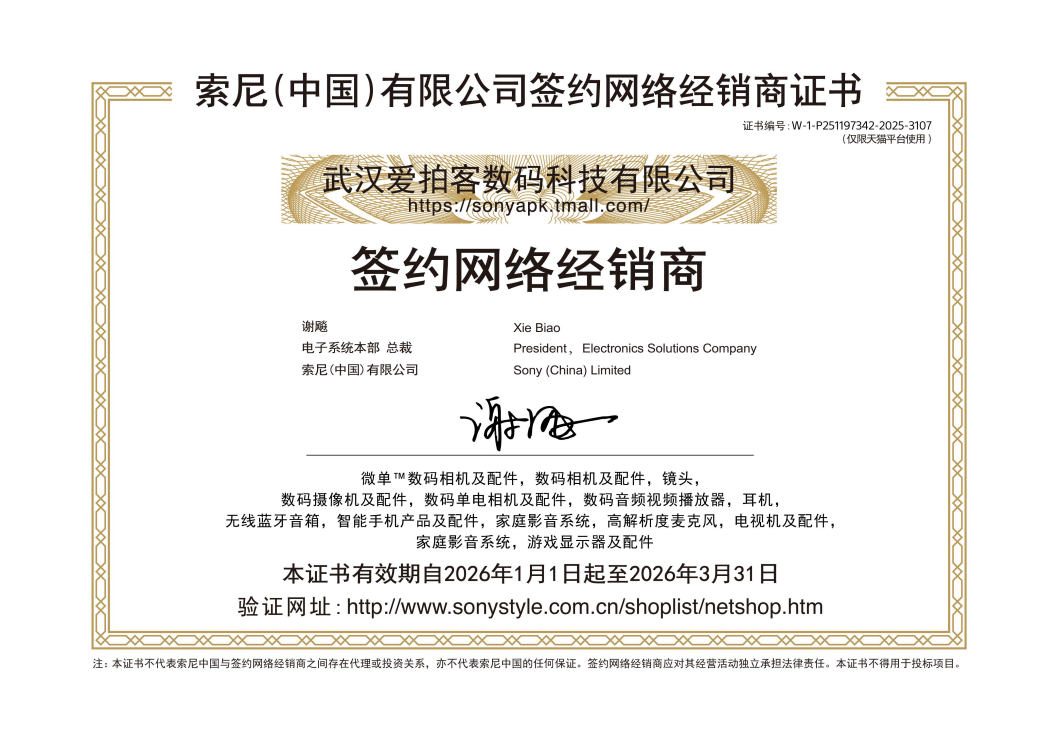 | 武汉爱拍客数码科技有限公司 | W-1-P251197342-2025-3107 | 天猫 | https://sonyapk.tmall.com | 查看证书收起证书 |