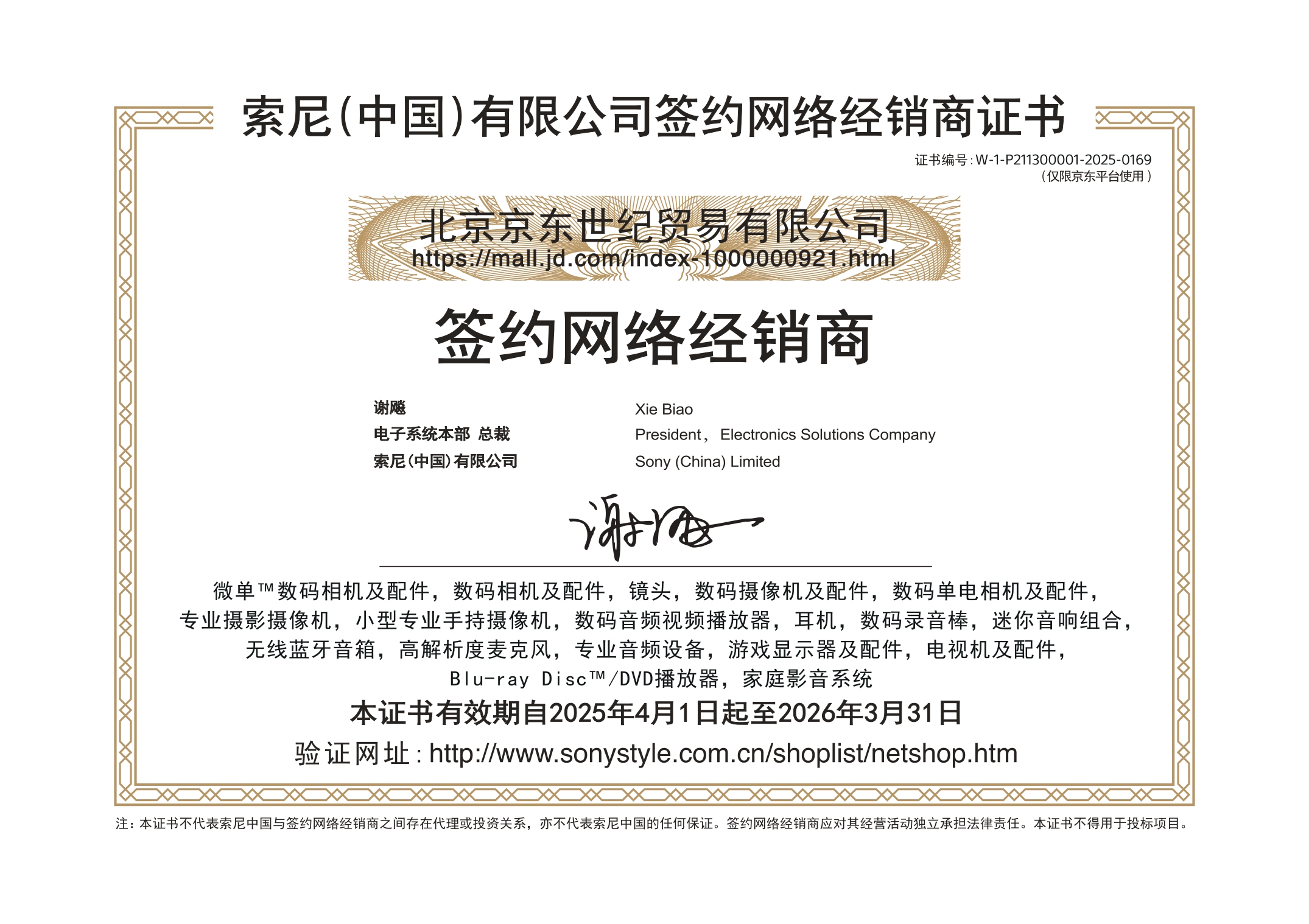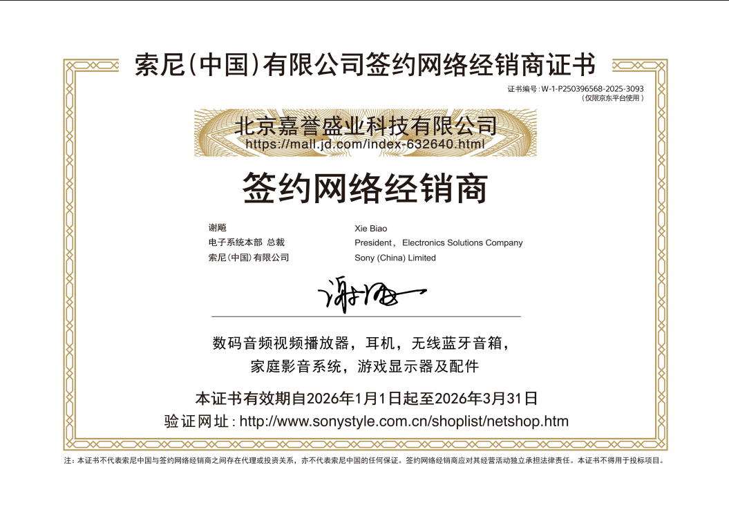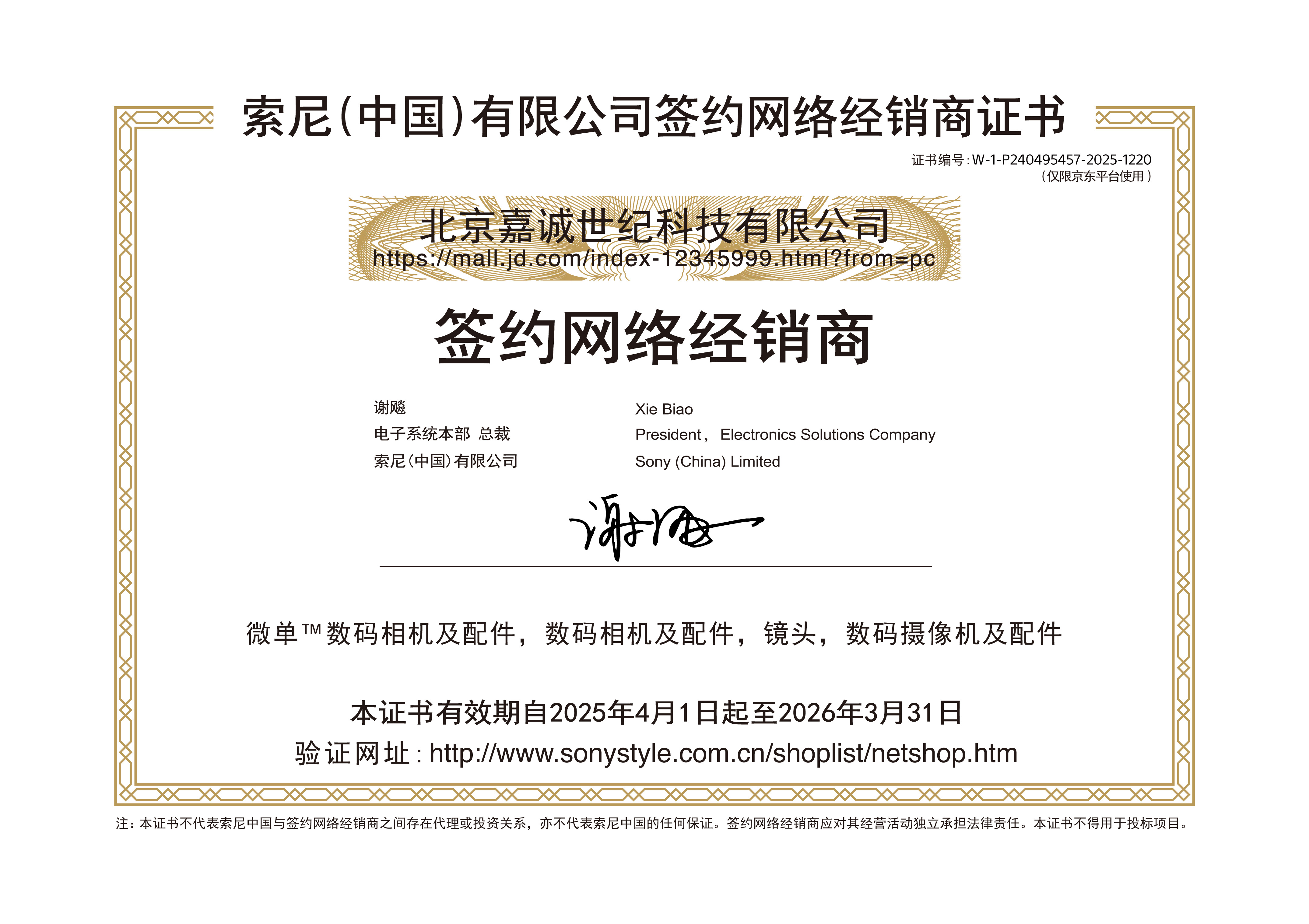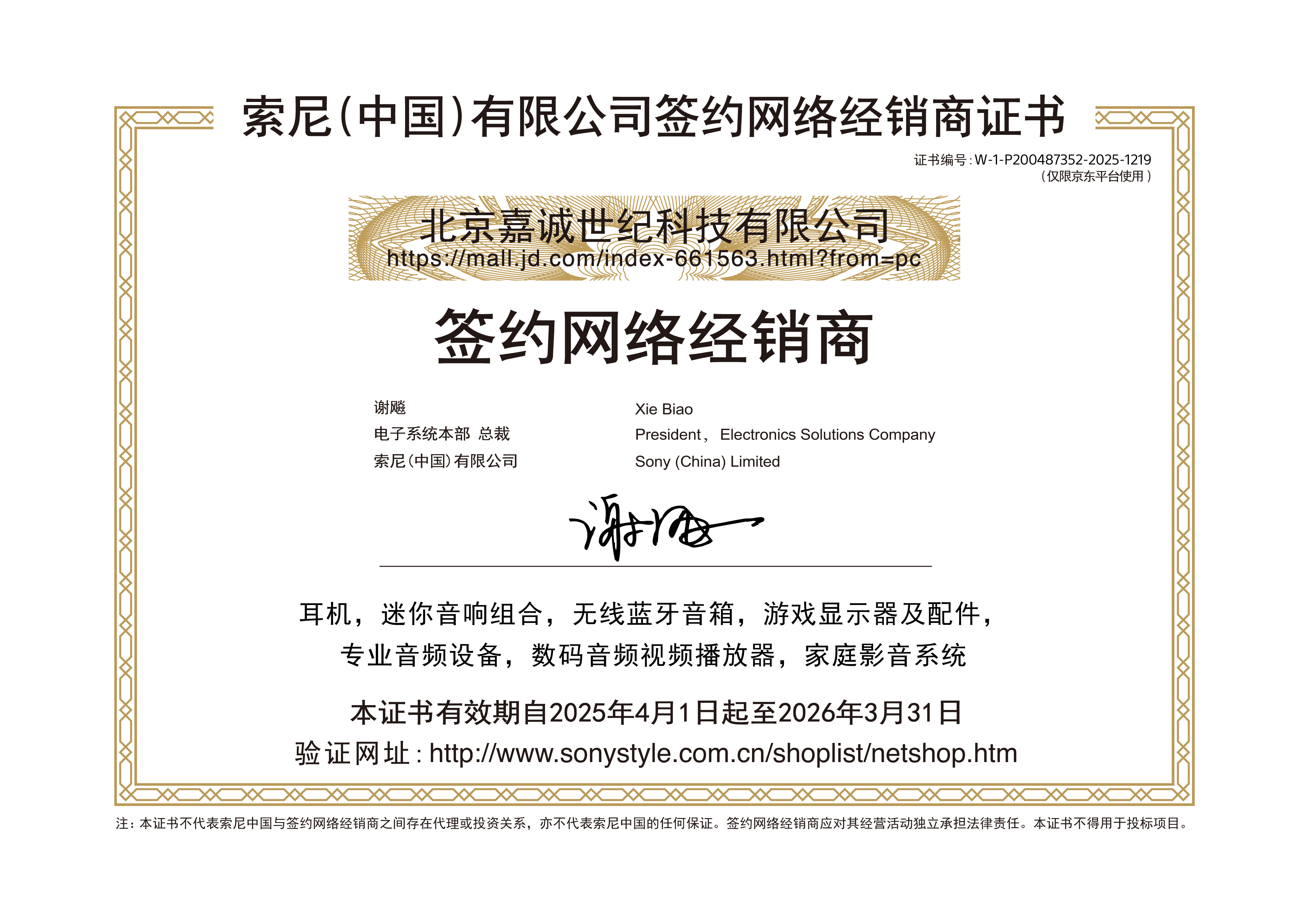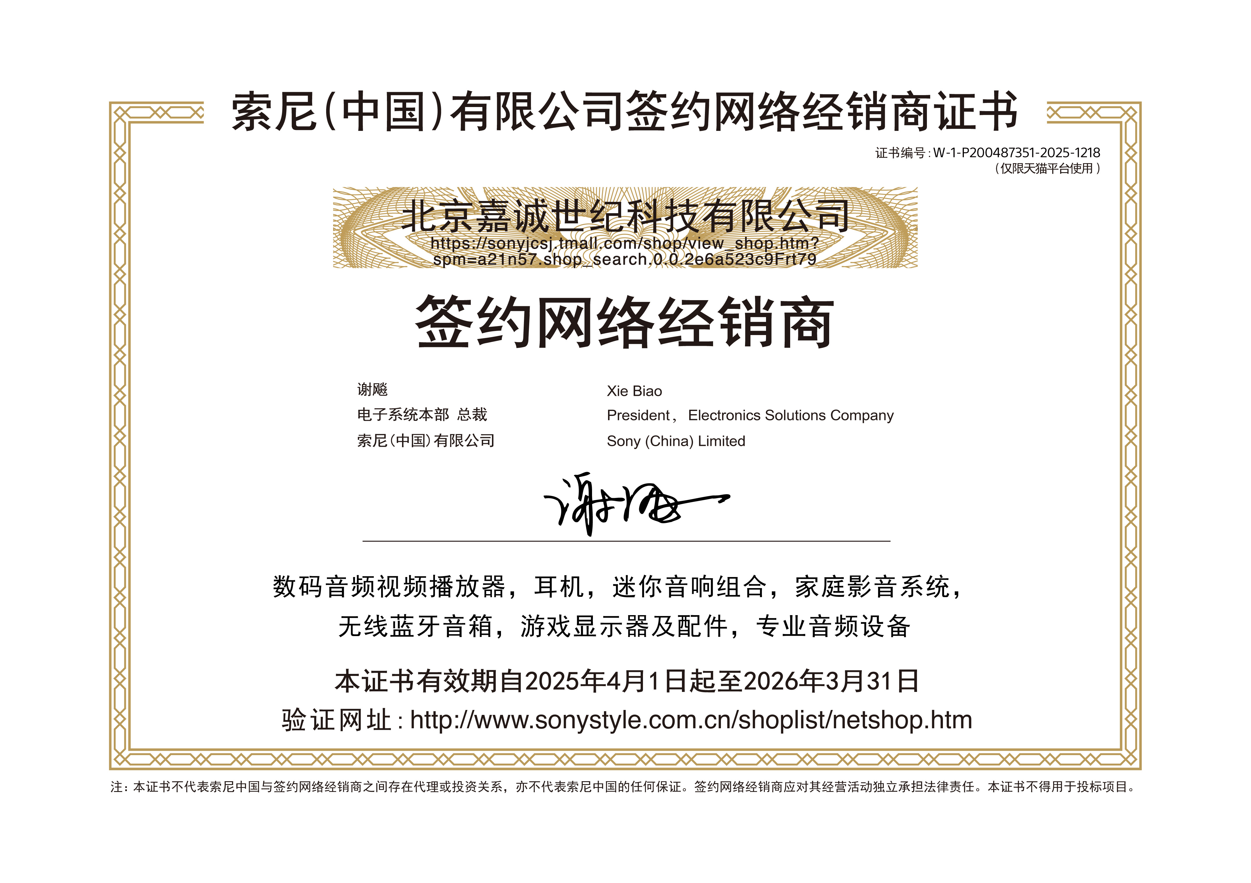 | 北京嘉诚世纪科技有限公司 | W-1-P200487351-2025-1218 | 天猫 | https://sonyjcsj.tmall.com/shop/view_shop.htm?spm=a21n57.shop_search.0.0.2e6a523c9Frt79 | 查看证书收起证书 |