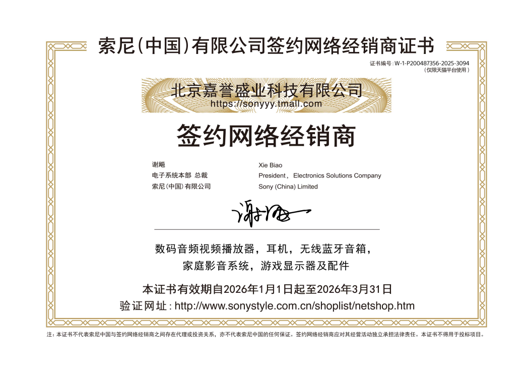 | 北京嘉誉盛业科技有限公司 | W-1-P200487356-2025-3094 | 天猫 | https://sonyyy.tmall.com | 查看证书收起证书 |