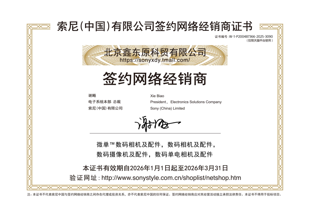 | 北京鑫东原科贸有限公司 | W-1-P200487366-2025-3090 | 天猫 | https://sonyxdy.tmall.com/ | 查看证书收起证书 |