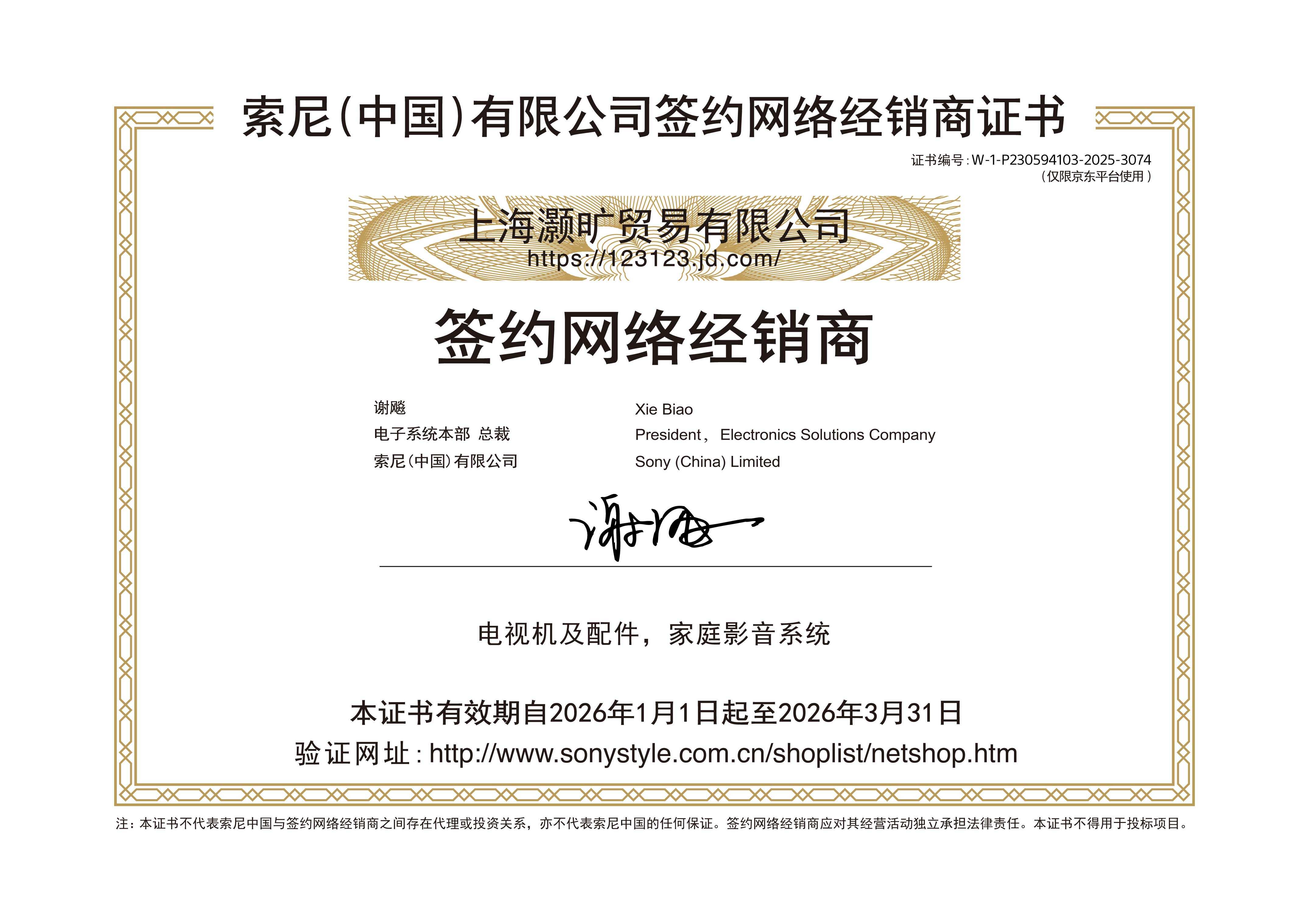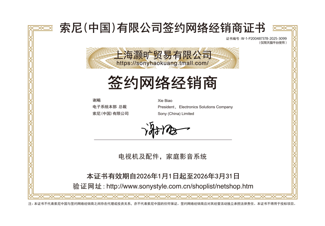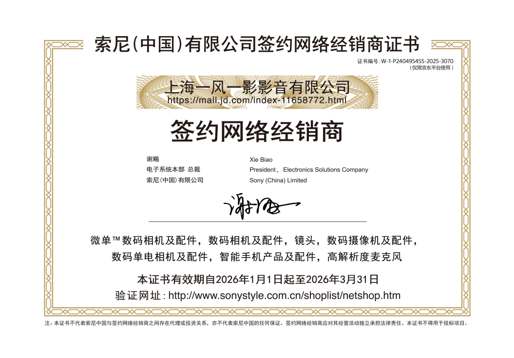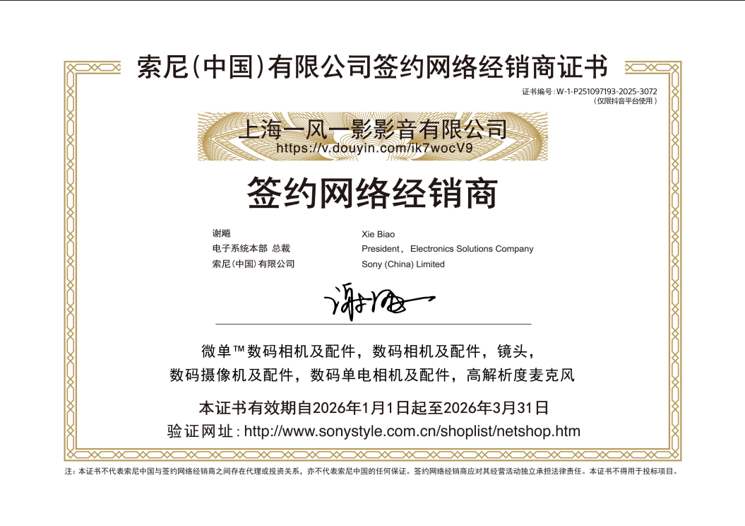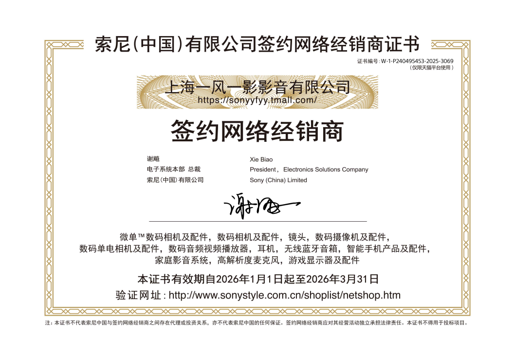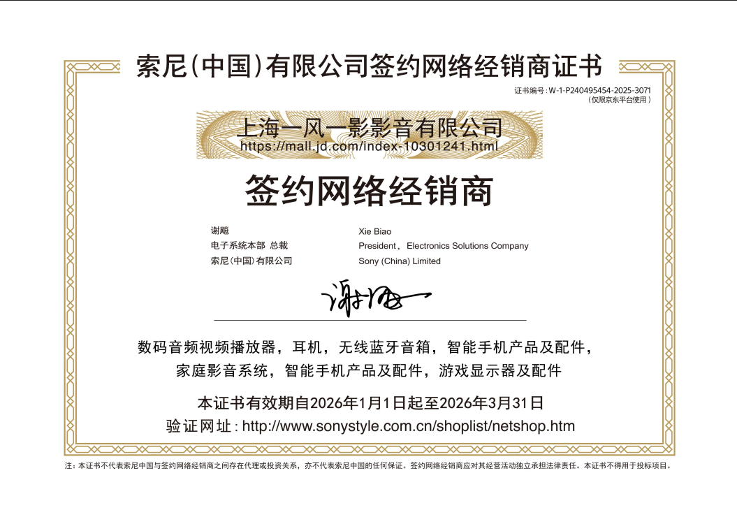 | 上海一风一影影音有限公司 | W-1-P240495453-2025-3069 | 天猫 | https://sonyyfyy.tmall.com/ | 查看证书收起证书 |