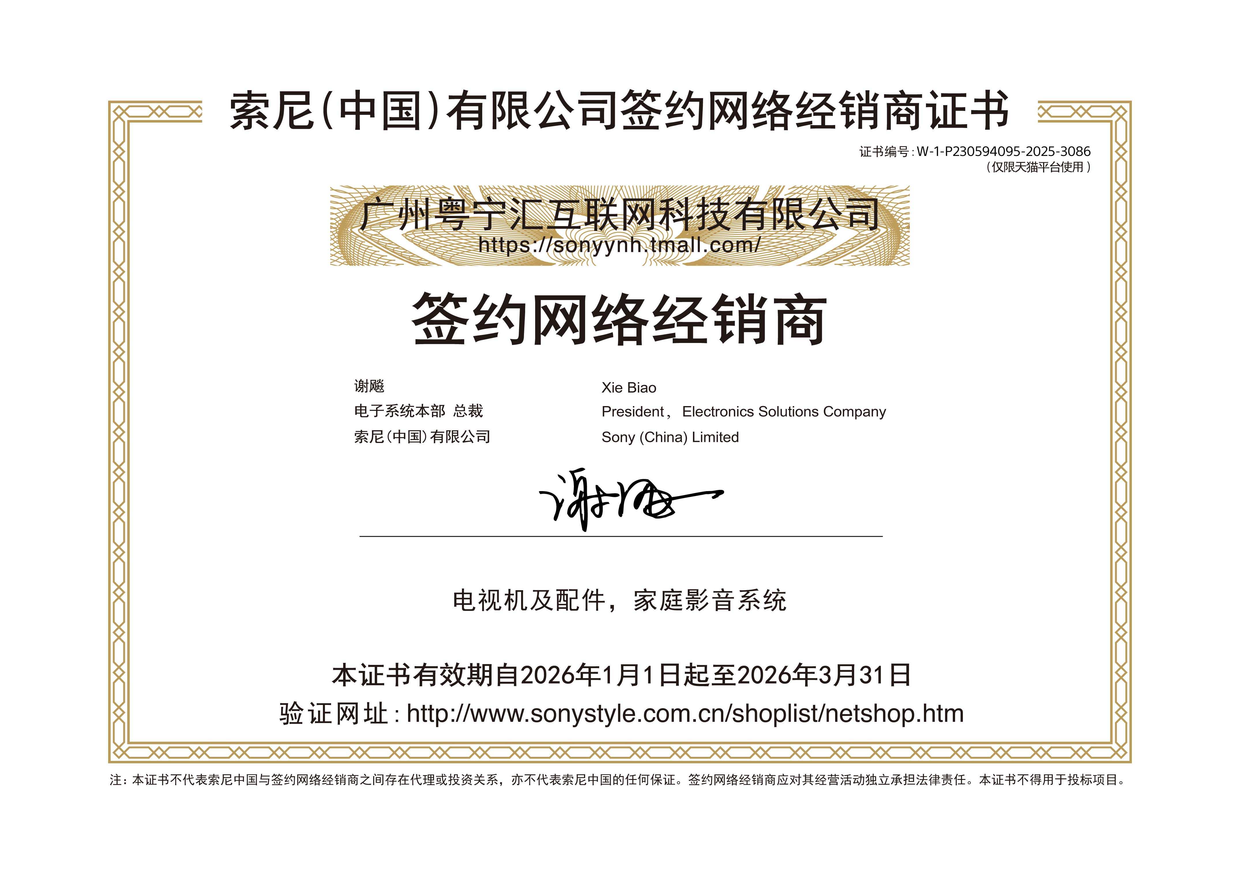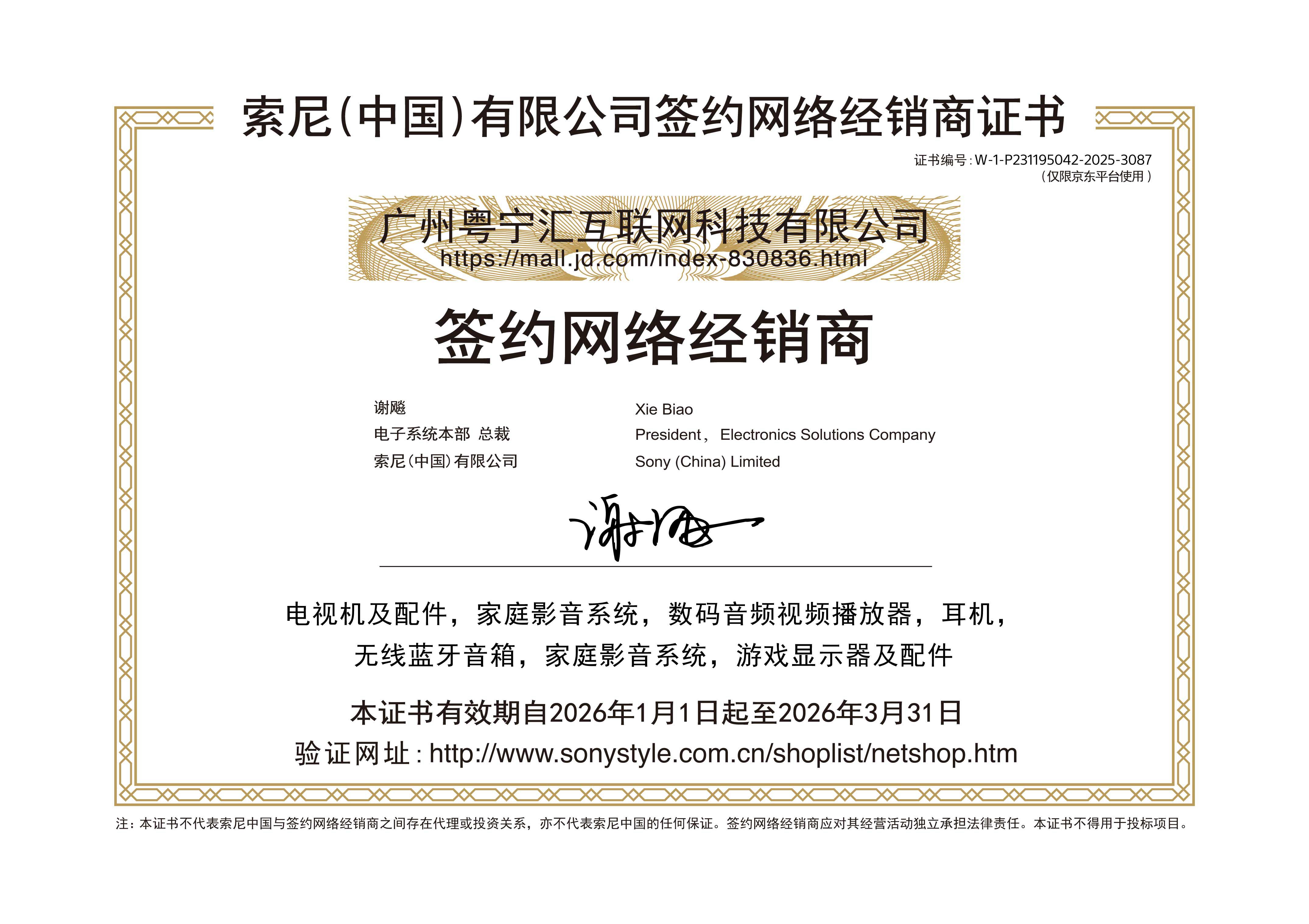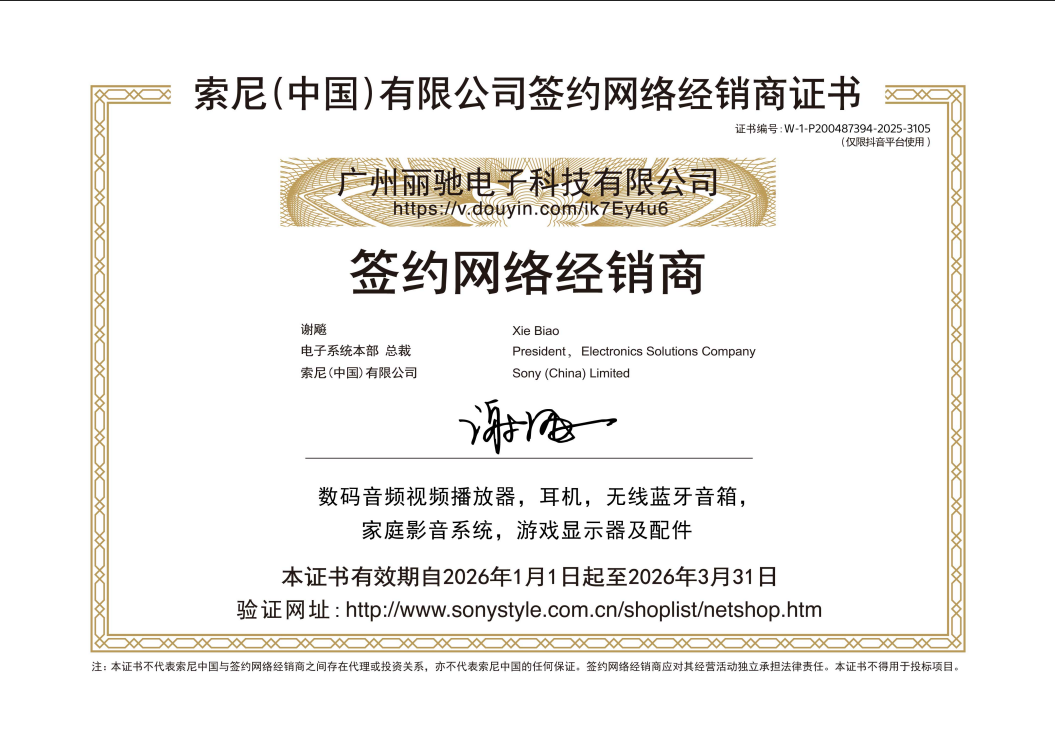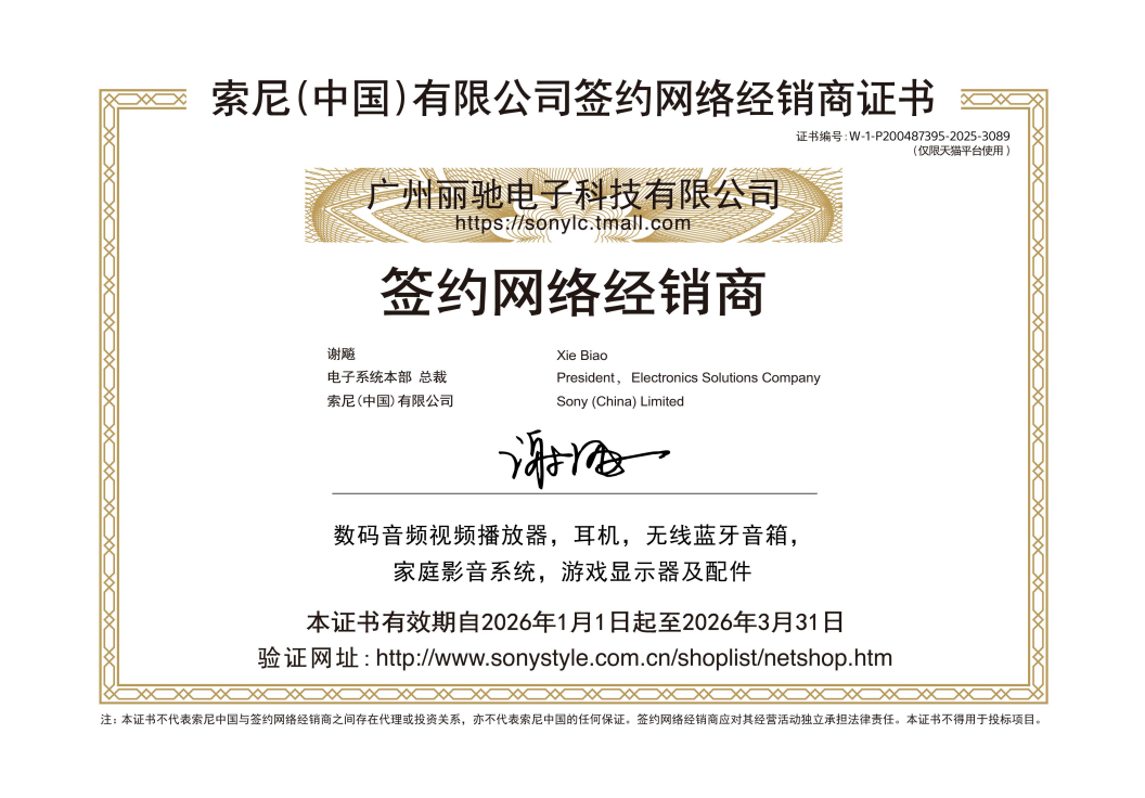 | 广州丽驰电子科技有限公司 | W-1-P200487395-2025-3089 | 天猫 | https://sonylc.tmall.com | 查看证书收起证书 |