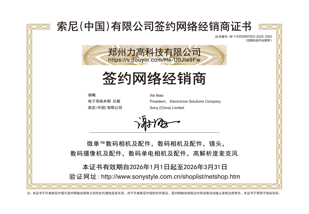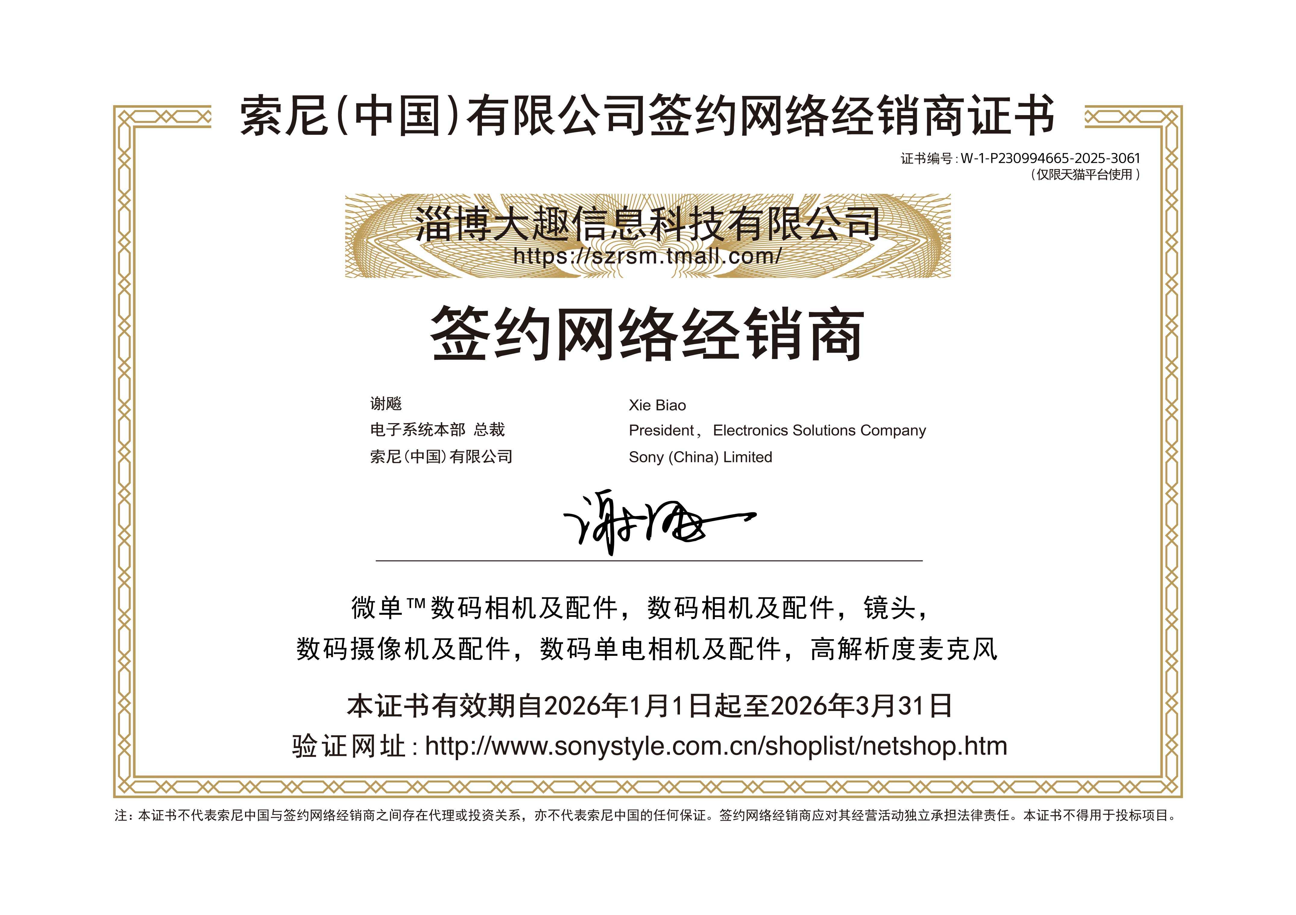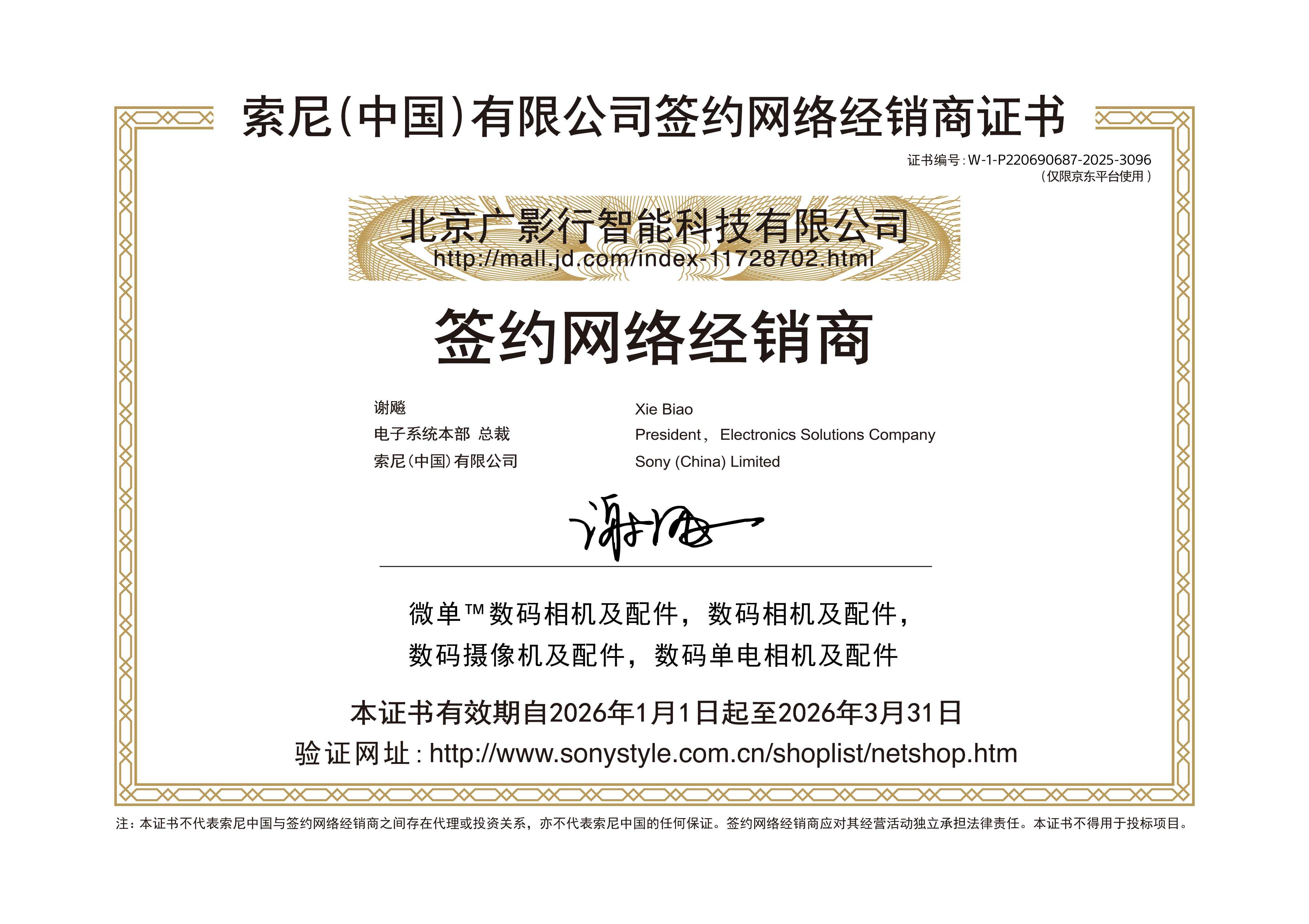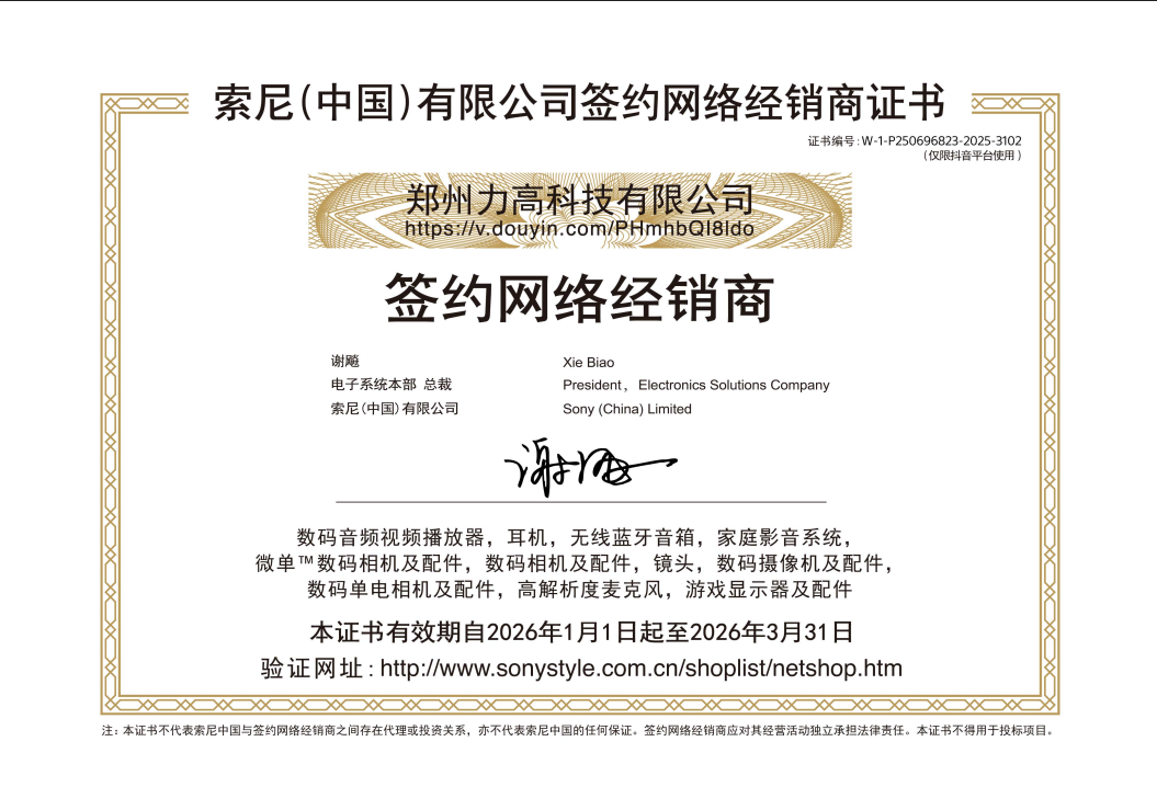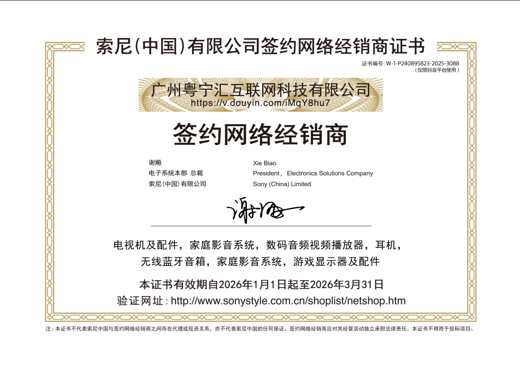 | 广州丽驰电子科技有限公司 | W-1-P200487395-2025-3089 | 天猫 | https://sonylc.tmall.com | 查看证书收起证书 |