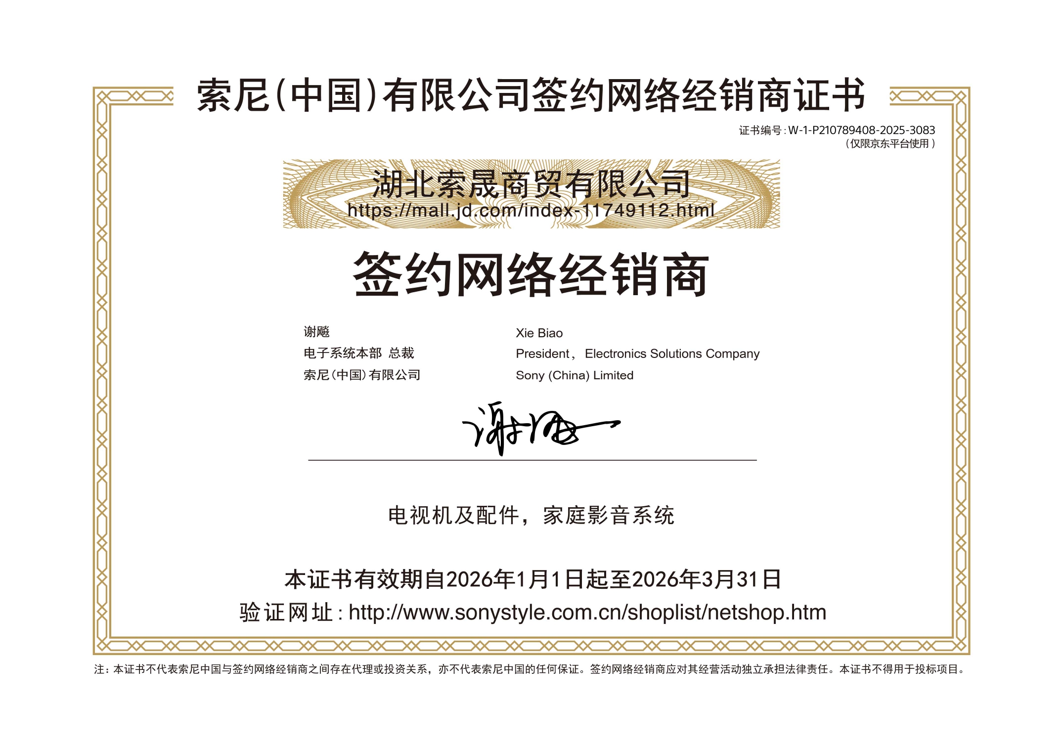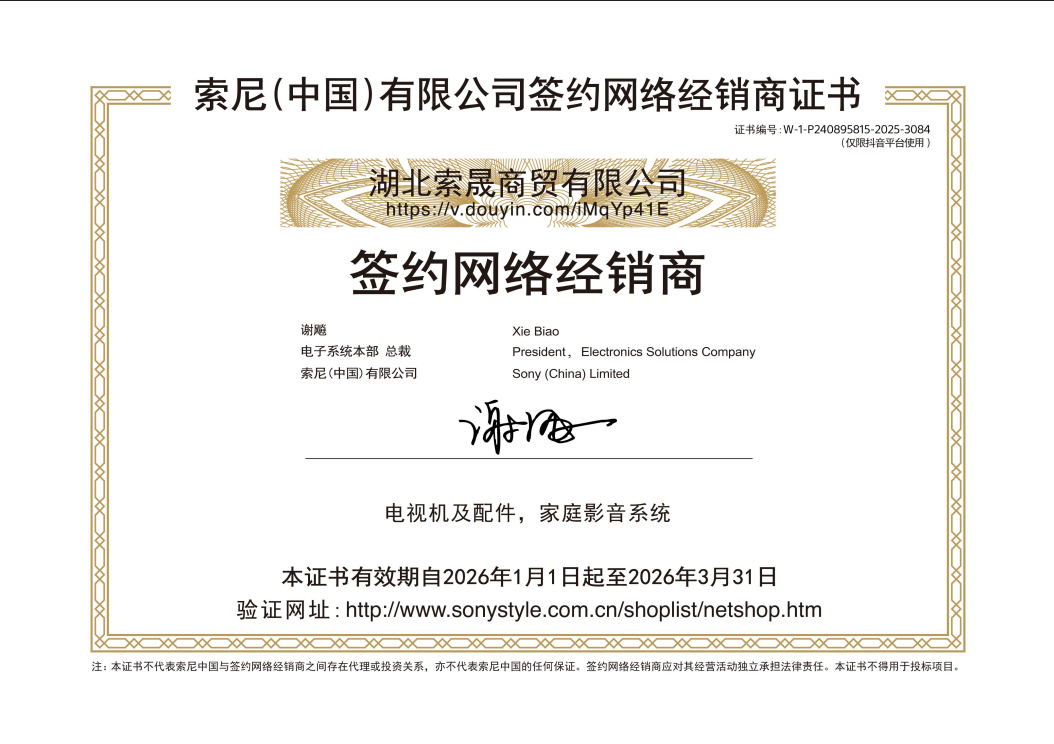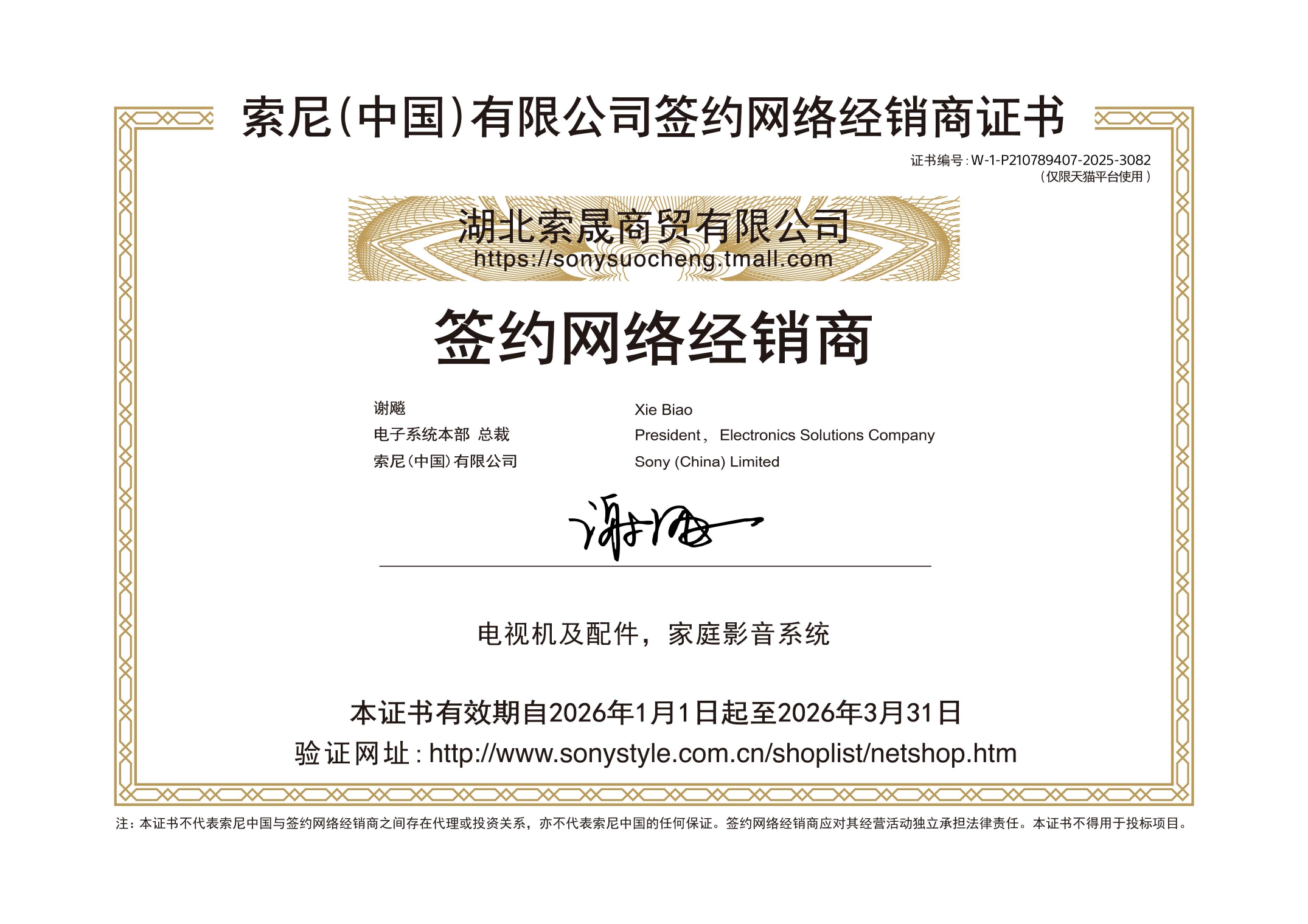 | 湖北索晟商贸有限公司 | W-1-P210789407-2025-3082 | 天猫 | https://sonysuocheng.tmall.com | 查看证书收起证书 |