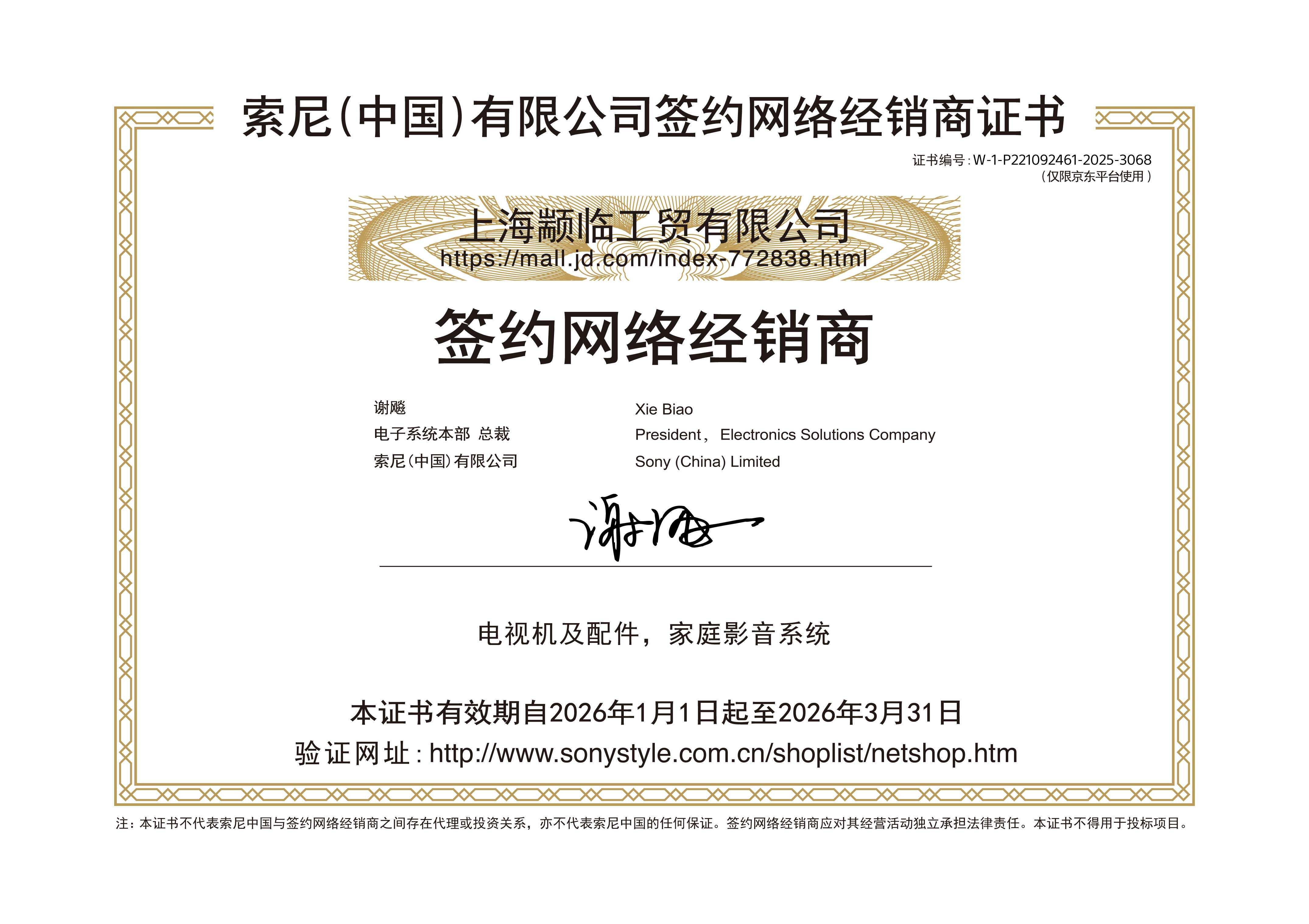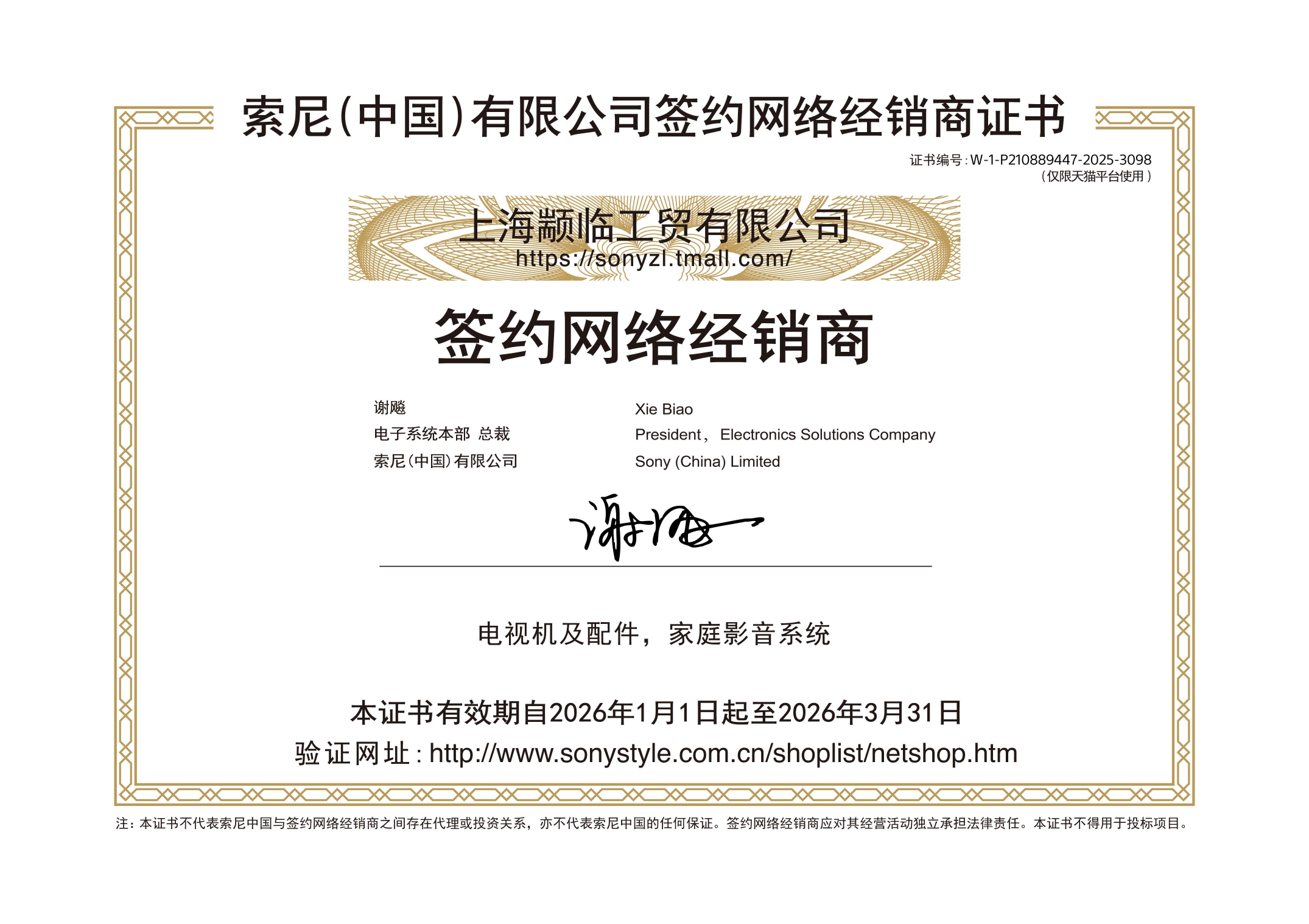 | 上海颛临工贸有限公司 | W-1-P210889447-2025-3098 | 天猫 | https://sonyzl.tmall.com/ | 查看证书收起证书 |