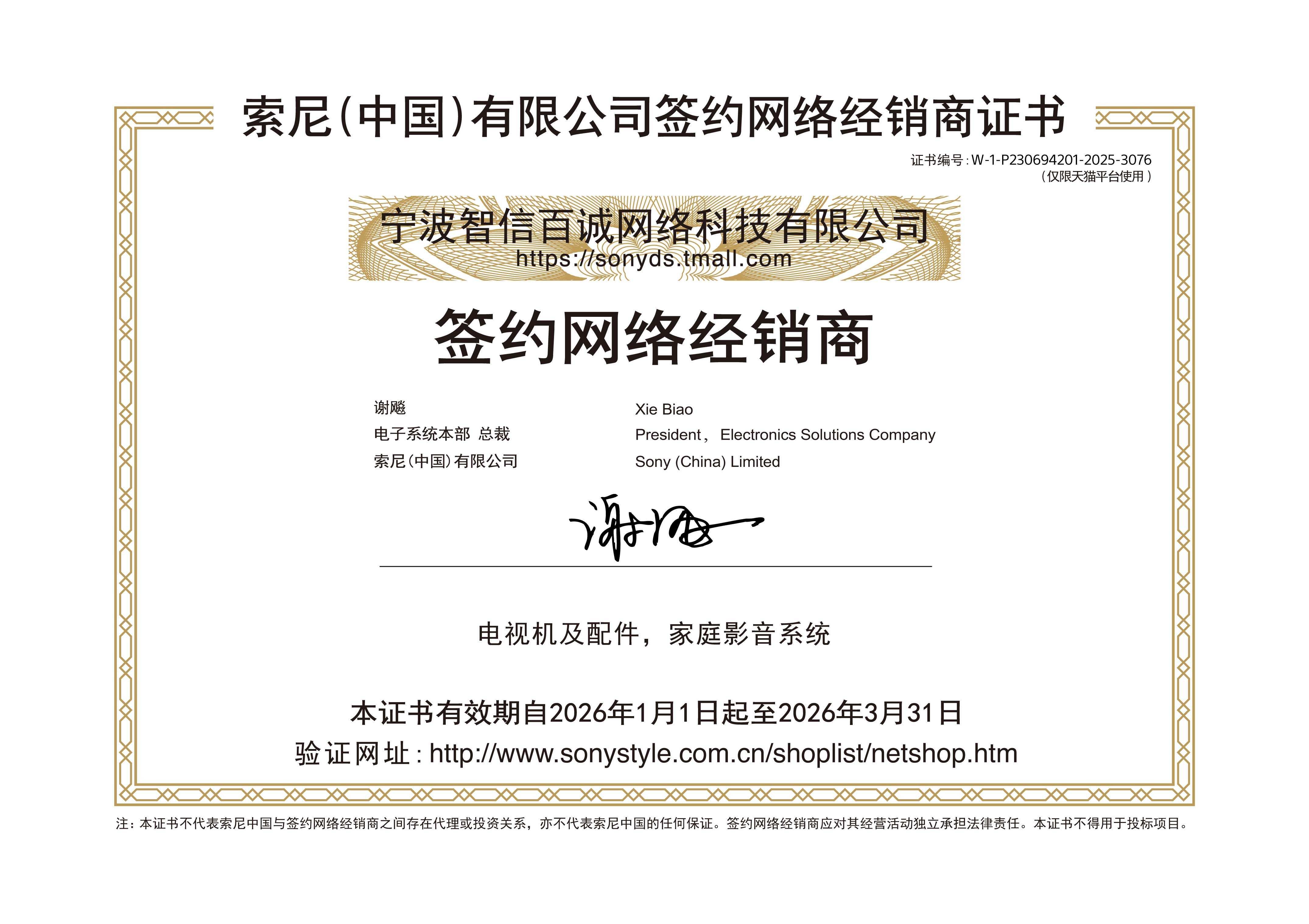 | 宁波智信百诚网络科技有限公司 | W-1-P230694201-2025-3076 | 天猫 | https://sonyds.tmall.com | 查看证书收起证书 |