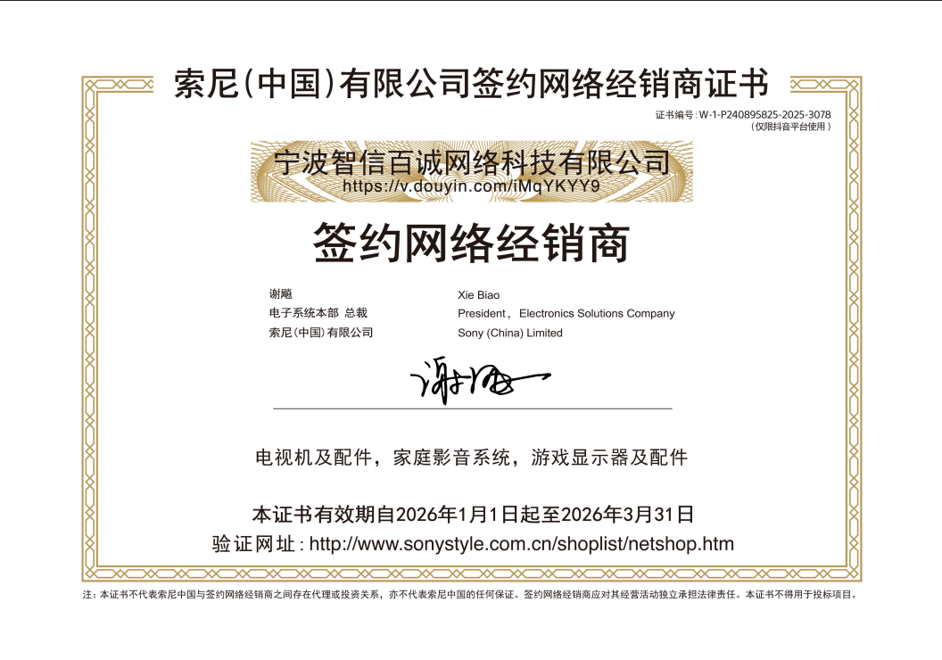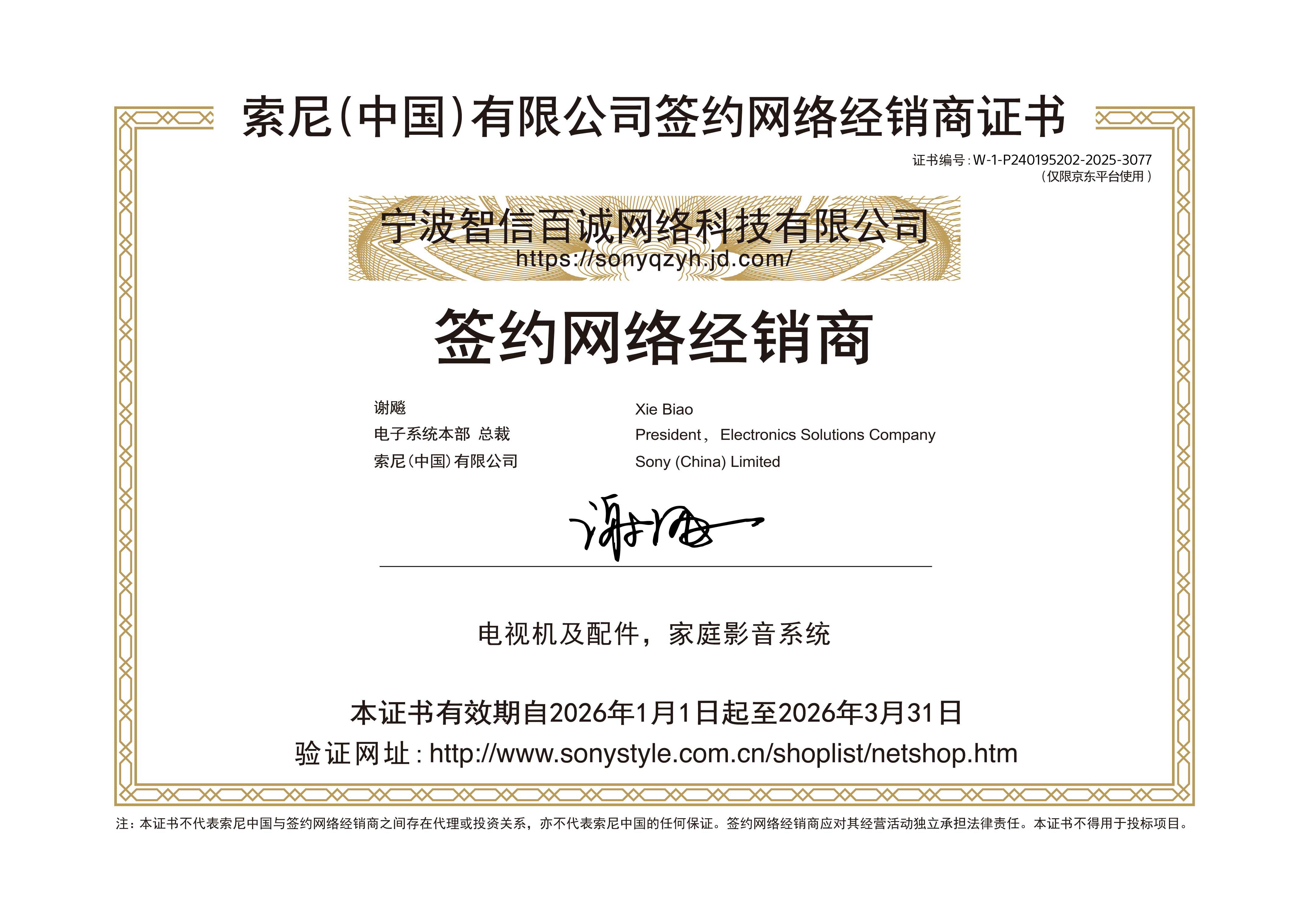 | 宁波智信百诚网络科技有限公司 | W-1-P240195202-2025-3077 | 京东 | https://sonyqzyh.jd.com/ | 查看证书收起证书 |