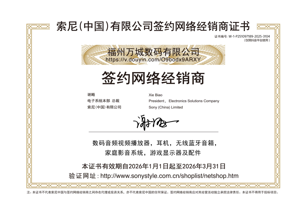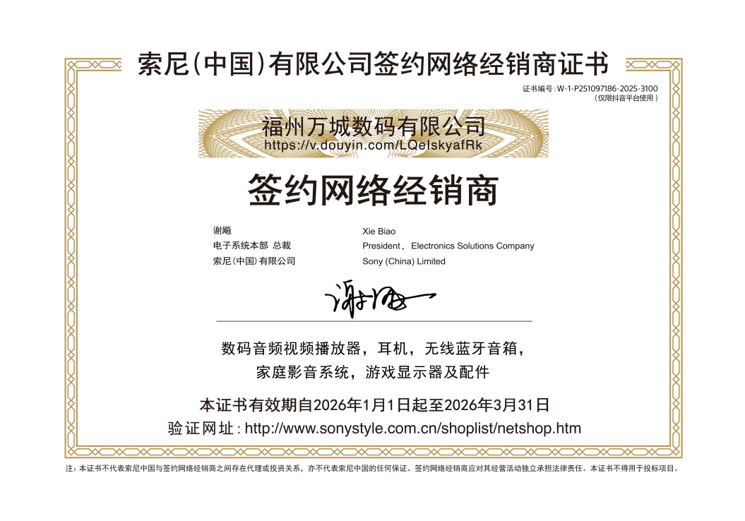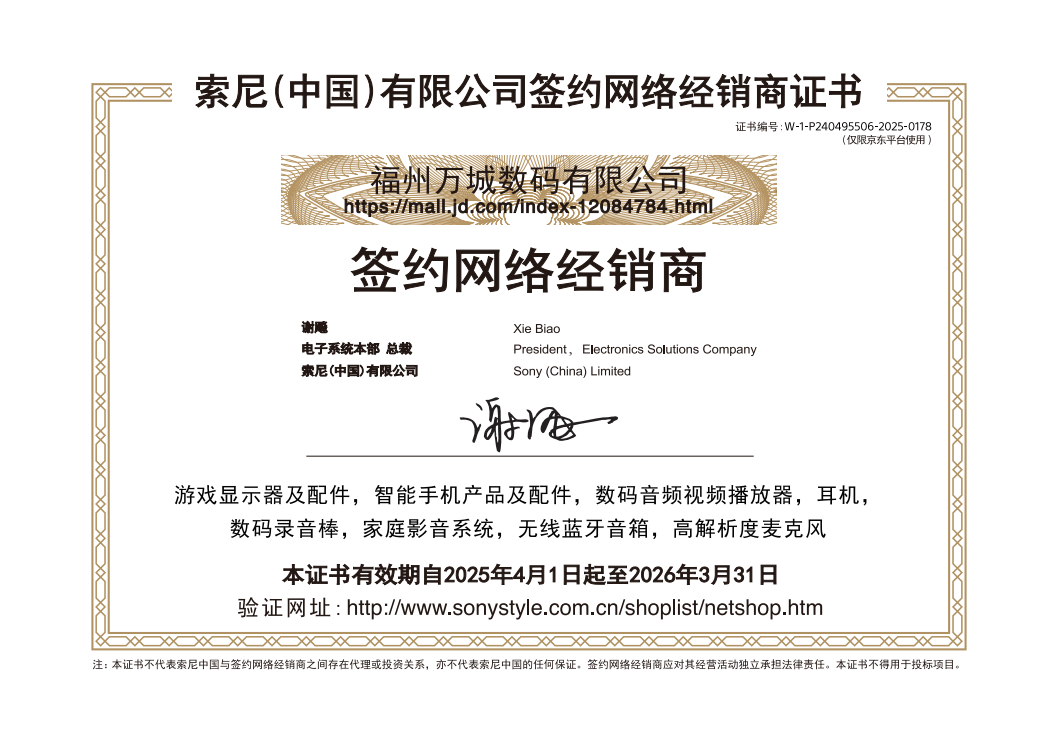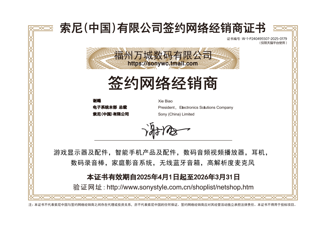 | 福州万城数码有限公司 | W-1-P240495507-2025-0179 | 天猫 | https://sonywc.tmall.com | 查看证书收起证书 |
