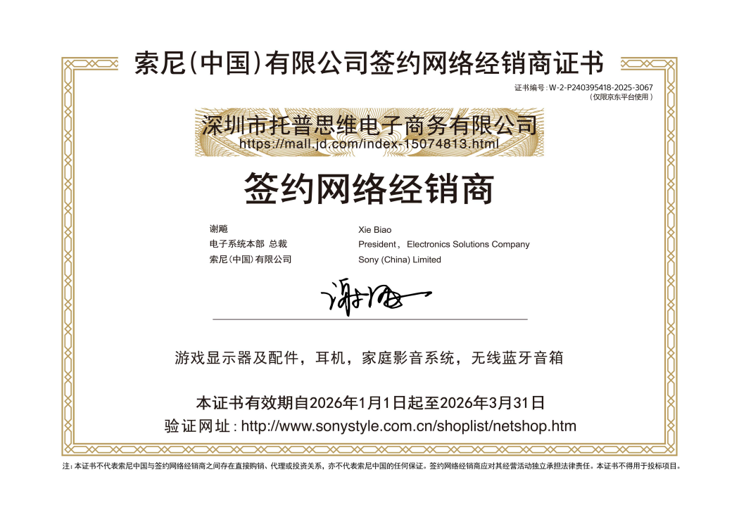 | 深圳市托普思维电子商务有限公司 | W-2-P240395419-2025-3066 | 天猫 | https://sonytpsw.tmall.com | 查看证书收起证书 |