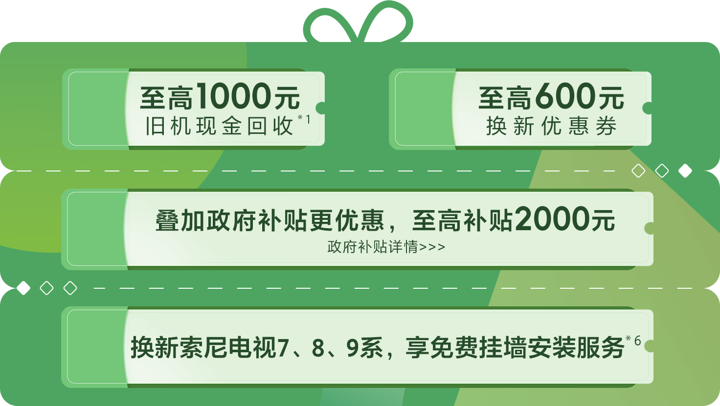 顾客自2025年7月1日起至2026年3月31日参与以旧换新活动(“本活动”)将旧电视机(“旧机”)依照本活动规则交给第三方回收企业嗨回收——上海霖承环保科技有限公司(“回收商”)完成回收后,即可获得索尼的购机优惠券1张和回收商的回收补贴。