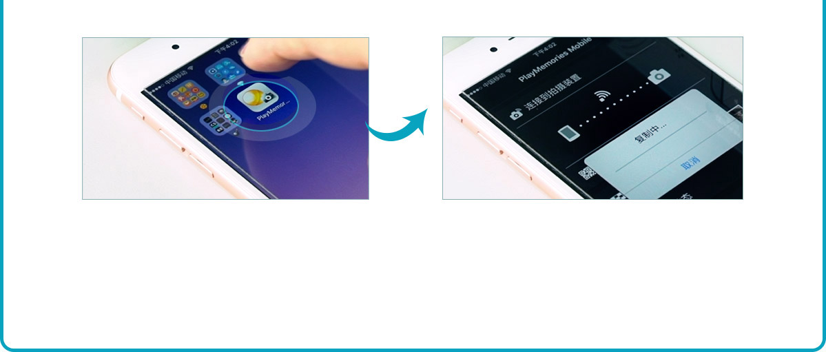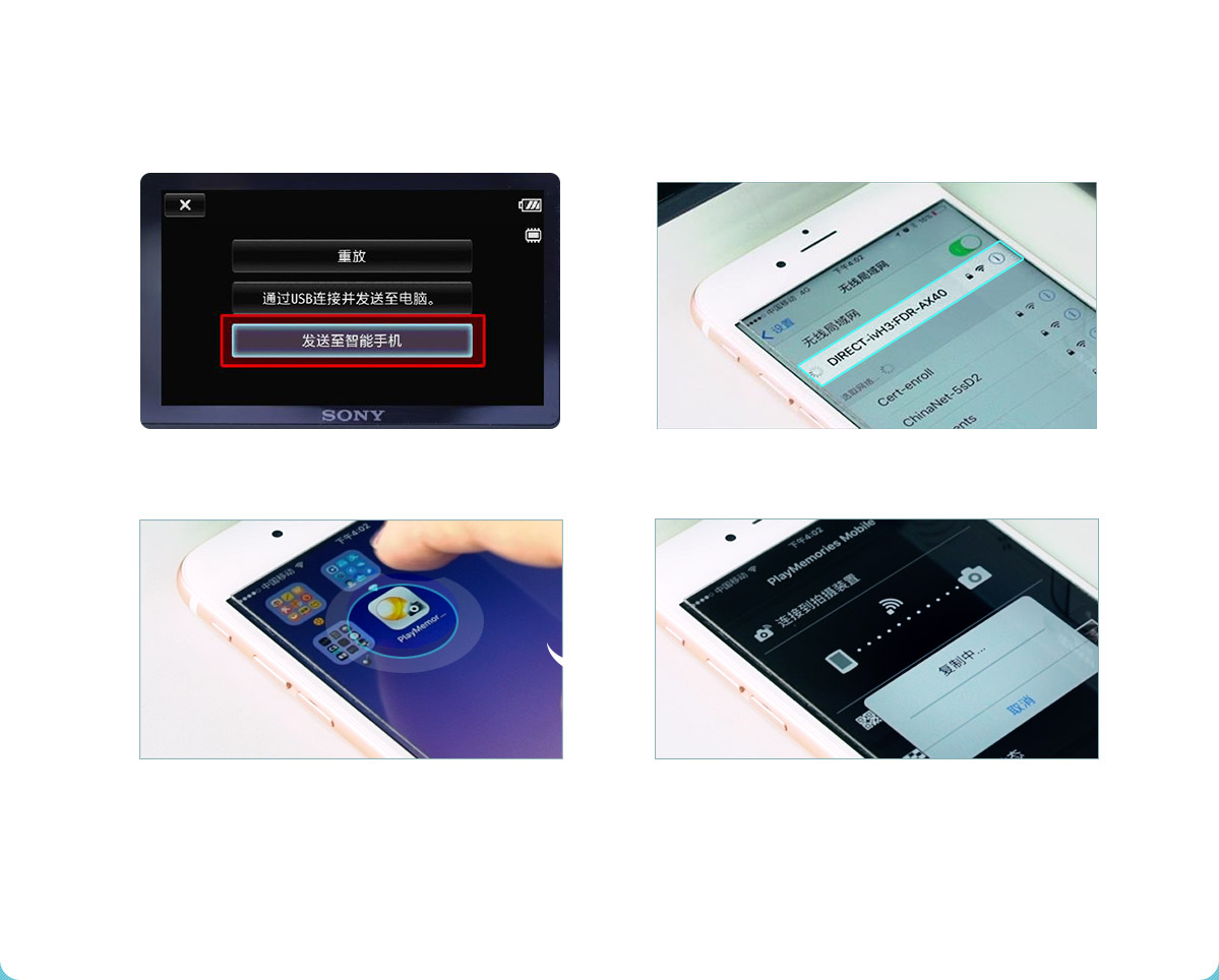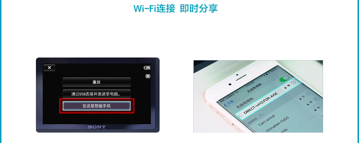 通过 Wi-Fi*2和 PlayMemories Mobile 软件(免费手机软件),将数码产品和智能手机连接。连接后,轻松将视频传到社交网络,精彩视频即时分享。