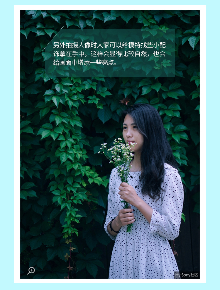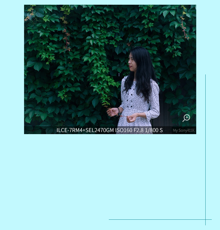 多亏了索尼ALPHA微单的强悍性能,在人像拍摄时我完全不用操心对焦点,开启了相机中的人物眼部对焦功能后,画面中只要出现人脸,相机会自动帮我对焦到人物的眼睛,而我只需要调整好构图以及参数,大大提高了我拍照的效率。