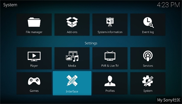 下载后,咱们进入KODI会看到全部都是英文的界面,要修改中文的话,先选择主界面的“设置”图标,进入“Inteface”界面。