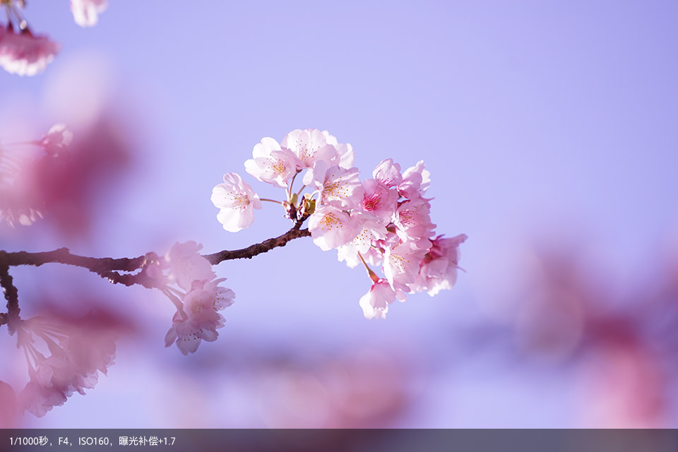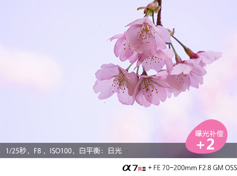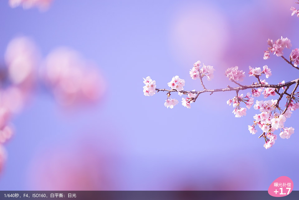 以天空或浅色亮调为背景拍摄花朵时,拍摄的花朵黯然无光,明显发灰。此时可将曝光补偿拨盘调至+方向,由我们自己判断何时是符合真实所见的画面效果。