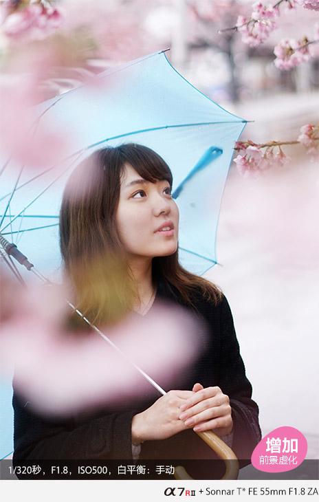 其实背景虚化大家肯定非常娴熟了,那在实际应用中还可尝试前景虚化。透过花丛拍摄人像,位于镜头前方的樱花会融化成浅粉云朵,为画面增添浪漫色彩。