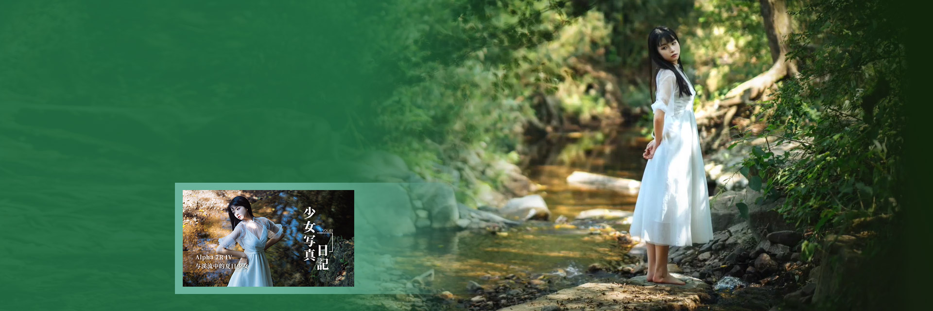 在溪流中拍摄夏日少女,中午时间非常适合。光线自上而下,可以穿过树林形成美丽的光斑,提升画面氛围。本期视频将教你把握光线,在大光比场景中拍出清新的少女写真。