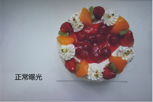 首先,在相机默认的多重测光模式下,我们拍摄出的照片有些偏暗,这是由于该场景当中背景以及蛋糕主体浅色调较多,导致相机测光偏差。