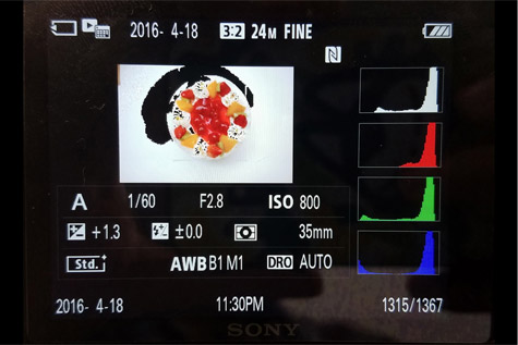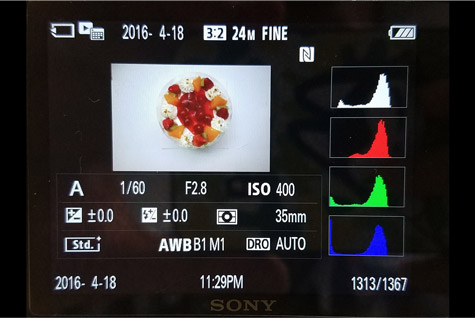 索尼微单™相机的电子取景器对于食物拍摄非常有利,相比传统光学取景器,电子取景器在拍摄时可以非常直观的看到被摄食物是否过曝,颜色是否正确。 并且电子取景器拥有100%的视野率,更方便拍摄者了解最终的照片是否是自己希望得到的构图结构。取景器看到的效果跟最终拍摄的照片完全一致,这就是‘所见即所得’。
