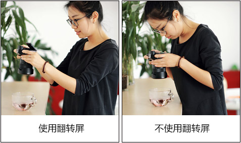 如果采用这种构图方式,一般采取的方式是俯拍,这时候,微单的可翻转屏幕就派上用场了。即使我们把它举高且镜头对准桌子,仍然可以通过旋转LCD屏幕进行取景。这样可以最大限度的确保取景时的画面垂直于桌面,从而控制画面中食物因为取景不水平导致的畸变效果。如果是没有翻转屏的相机,拍摄这种构图的照片时就会非常痛苦,因为拍摄者在观察取景是否准确时非常痛苦。