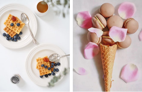 美食的拍摄角度上,应该根据食物的特点来选择构图方式。遵循“少即是多”和“三分之一”的黄金构图原则,即用简洁的布局来表达,适当留出一定空间,画面不要太满,主体通常不必放在中心位置。