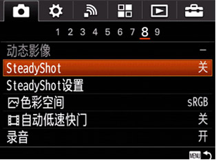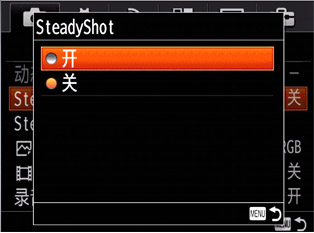 防抖功能设置方法:“MENU”键选择“SteadyShot”,设置为“开”,或者在镜身上直接选择。