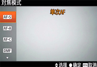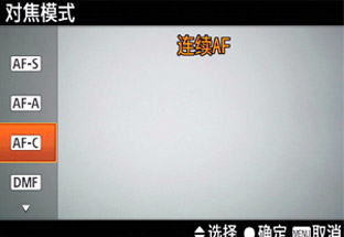 连续对焦设置方法:“MENU”键选择“对焦模式”,选择“AF-C”连续对焦。