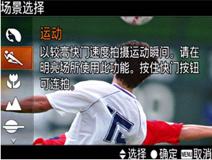 可能会有一些朋友觉得每次都要进入菜单设置很麻烦,这里推荐一种更简单的方法,在场景模式中选择“运动”模式,设置该模式后,相机会自动将拍摄模式设置为连拍,同时提高快门速度,需要拍摄时,只需简单一步即可开始拍摄。