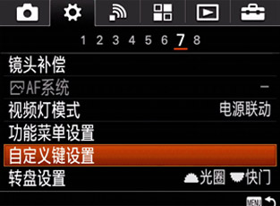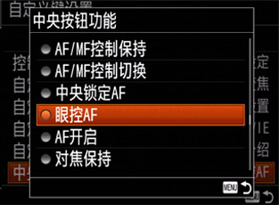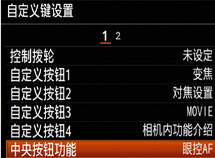 眼控AF设置方法:“MENU”键进入“自定义键设置”,选择“中央按钮功能”为“眼控AF”。