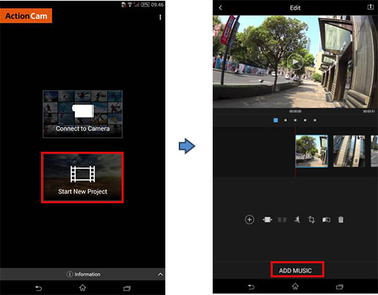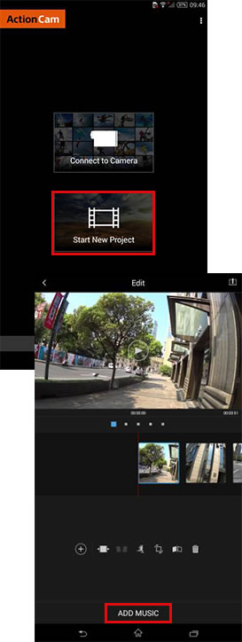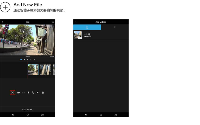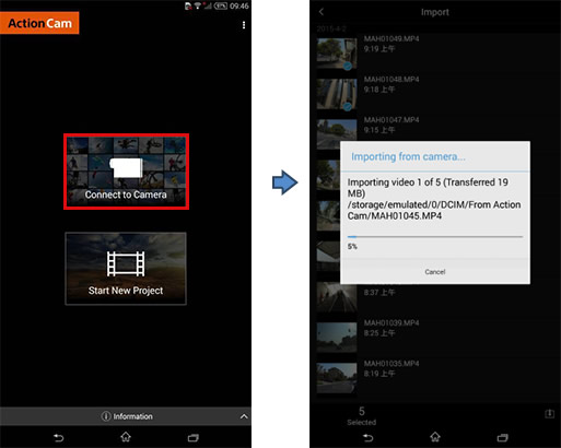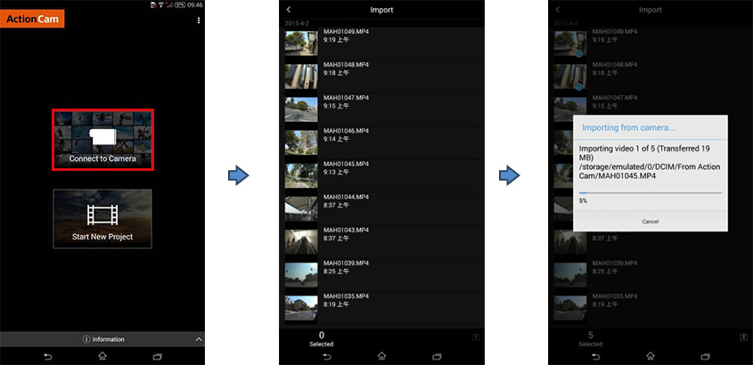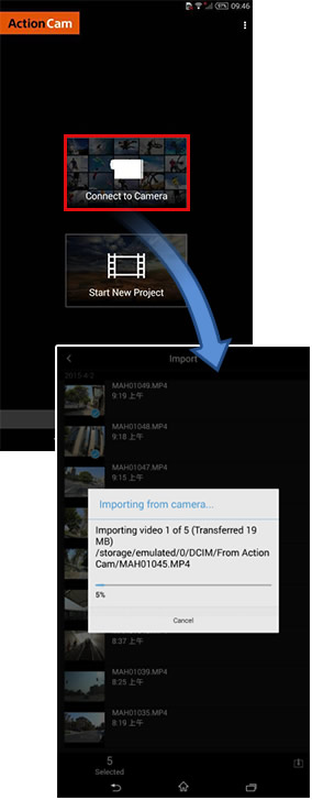 打开Action Cam App,选择 [ Connect to Camera ],点击选择要导入的视频,然后把这些文件从记忆卡中导入到智能手机里。