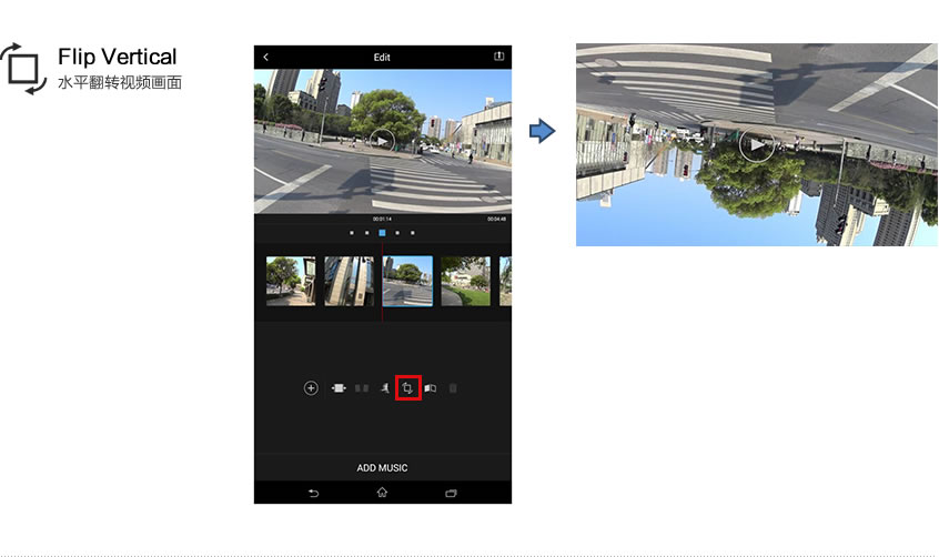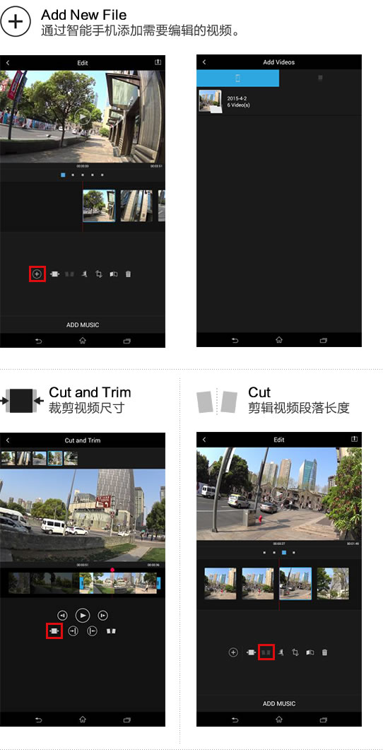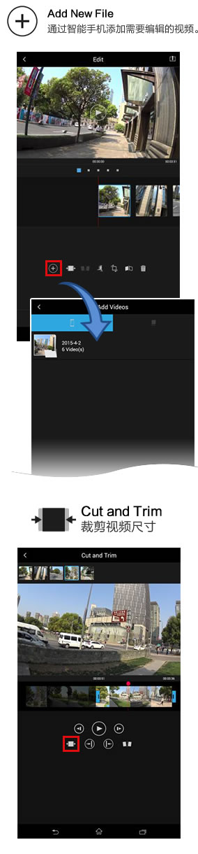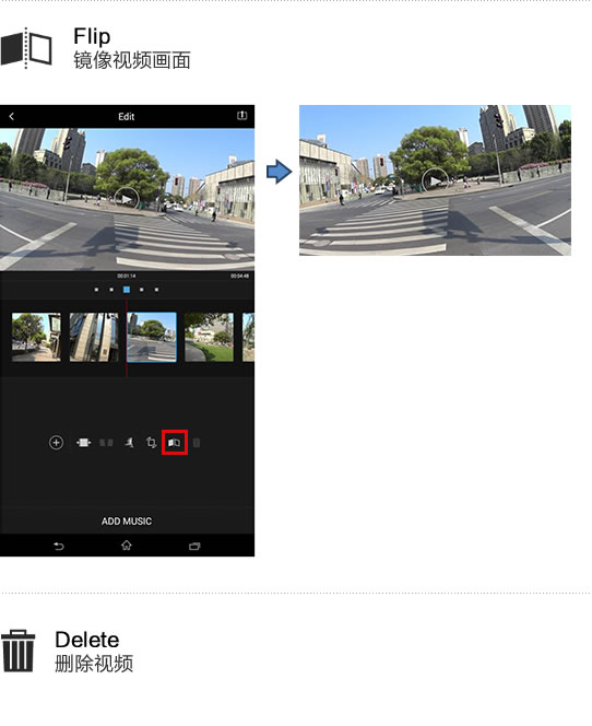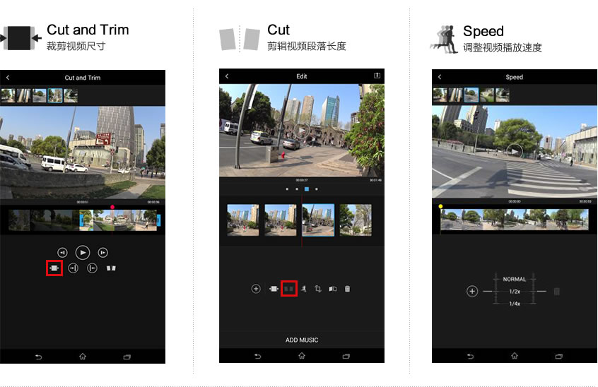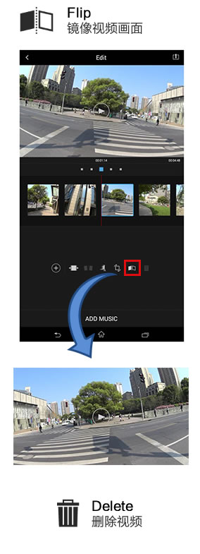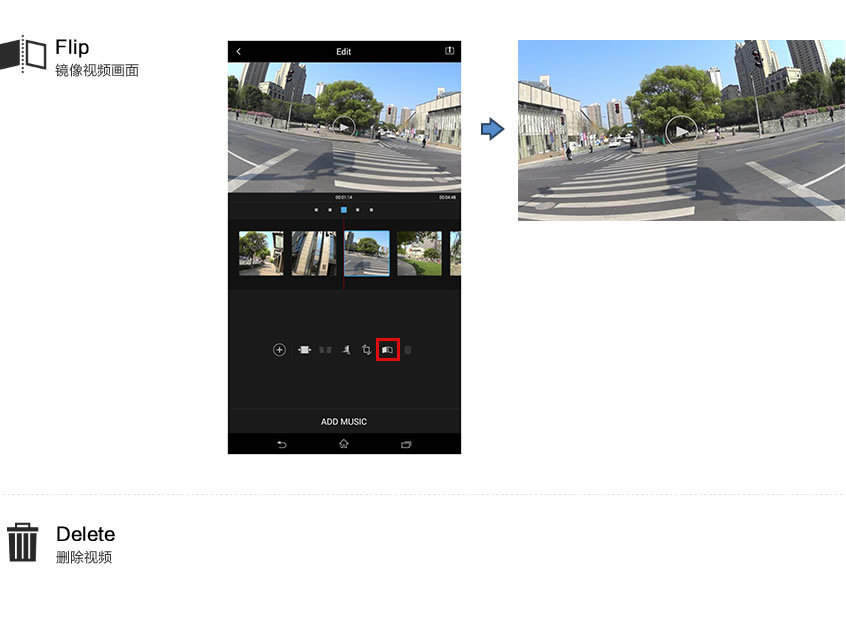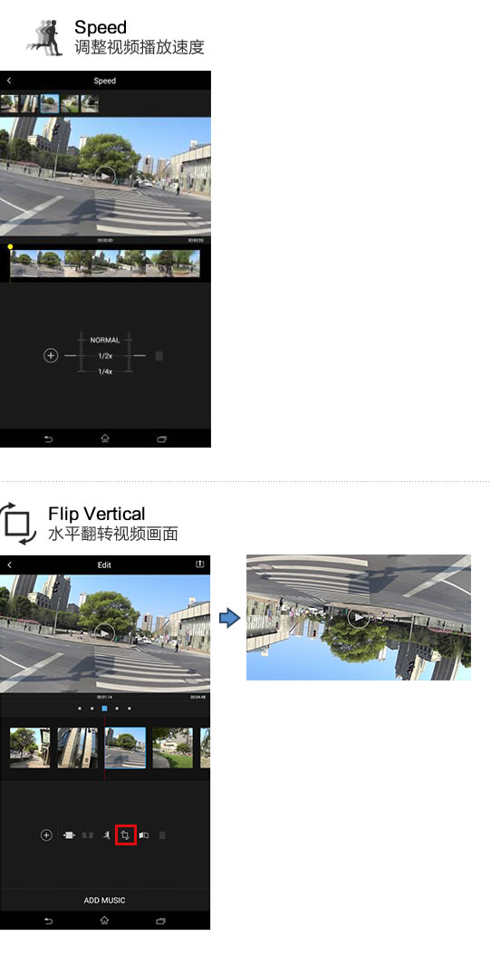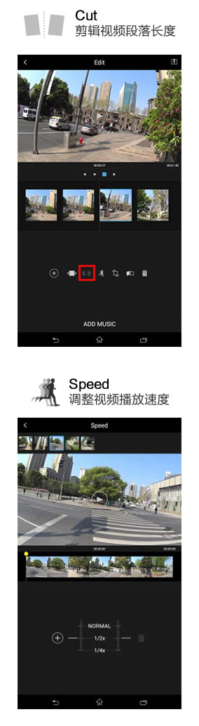 只通过Wi-Fi轻松传送视频到移动设备;简单、快速的剪辑和制作慢动作视频;运用垂直/水平翻转视频、添加音乐等特效轻松制作令人印象深刻的视频; 支持标清(720 30p)或高清(1080 30p /60p) 视频编辑、制作。