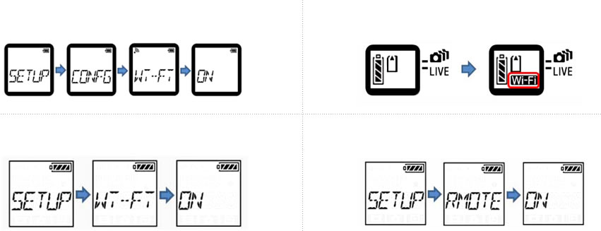 显示[ 单机连接 ]HDR-AS30V/AS20选择 [ SETUP]-[ Wi-Fi ]-[ ON ]