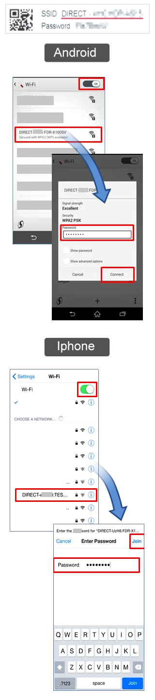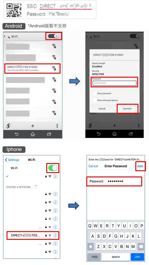 打开智能手机Wi-Fi,找到相应摄像机SSID,点击并输入密码* [ 仅限第一次连接 ]。