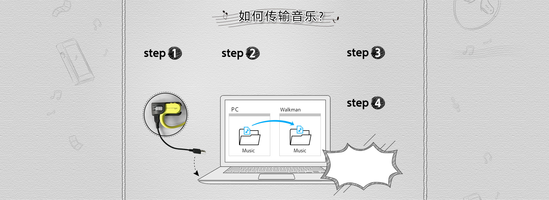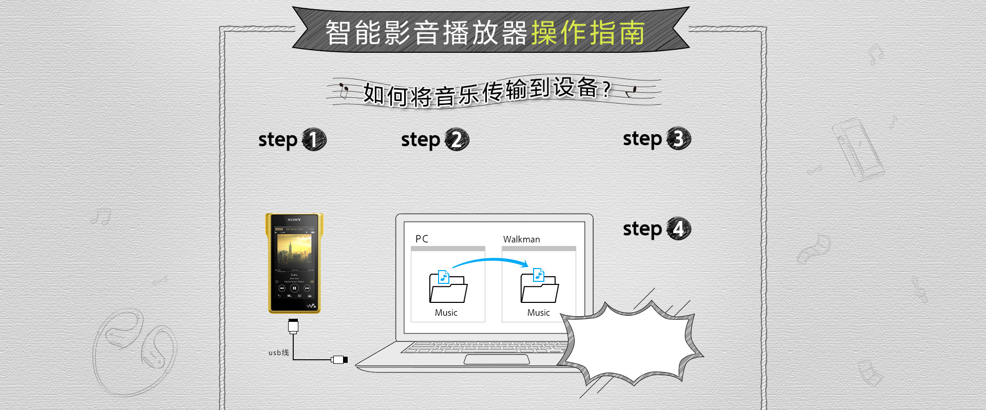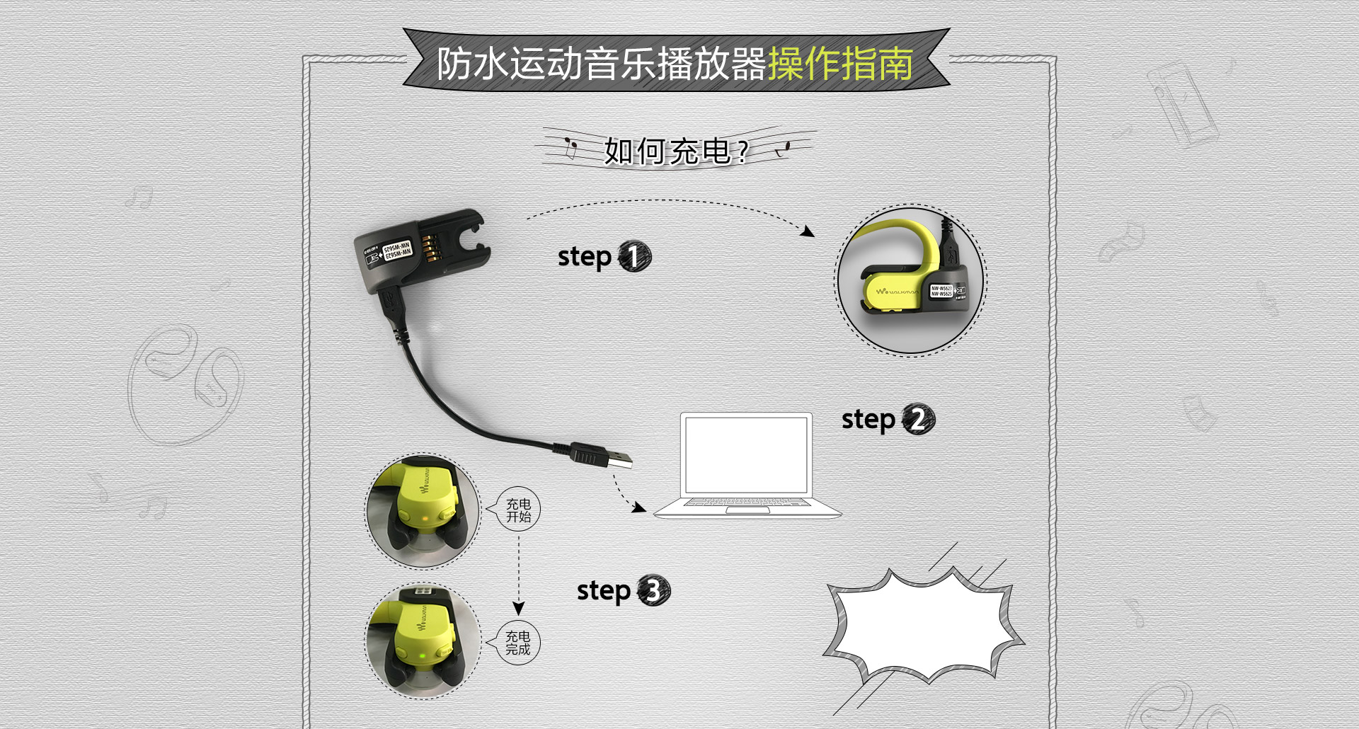 将USB连接线连接到USB底座上,然后将Walkman右侧充电接口连接到USB底座。(请确保Walkman的端子与USB底座相互接触)。