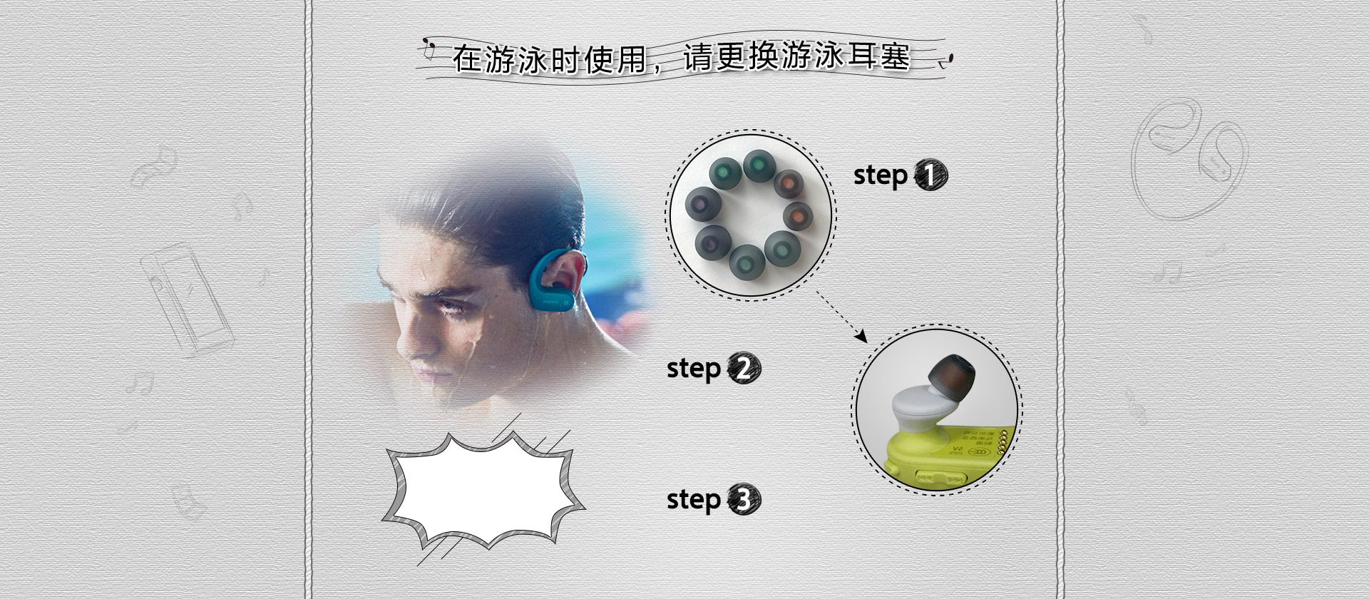 * 游泳耳塞的孔,覆盖有薄膜,以防进水。标准耳塞的孔是敞开的。不同颜色机型的耳塞颜色不同,请以包装内的实物为准。