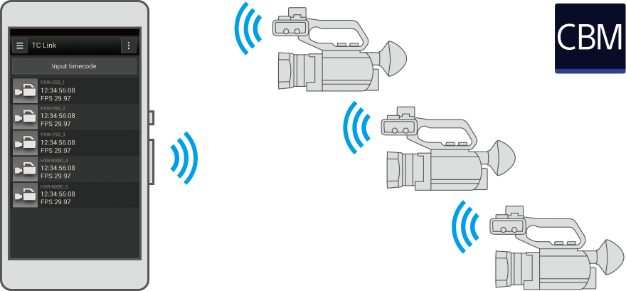 使用多台摄录一体机进行拍摄时,用户可使用手机的Content Browser Mobile™ (CBM)软件将它们的时间码进行同步(需使用选购的CBKZ-WTCL秘钥进行升级)。使用这一性能,每台摄录一体机都可以与选定的主摄录一体机实现同步,也可以按用户喜欢来手动设置时间码。
