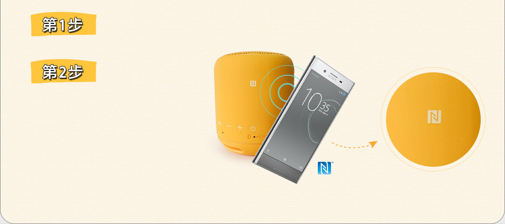 通过用智能手机*1等NFC兼容设备轻触扬声器*2,扬声器会自动打开,然后进行配对和连接。