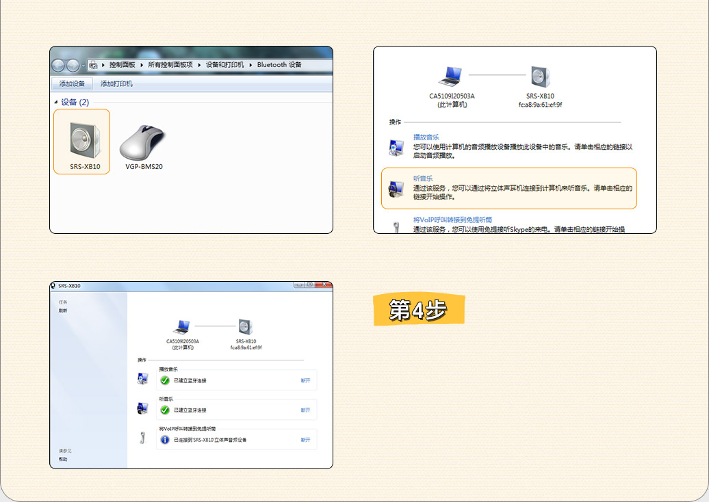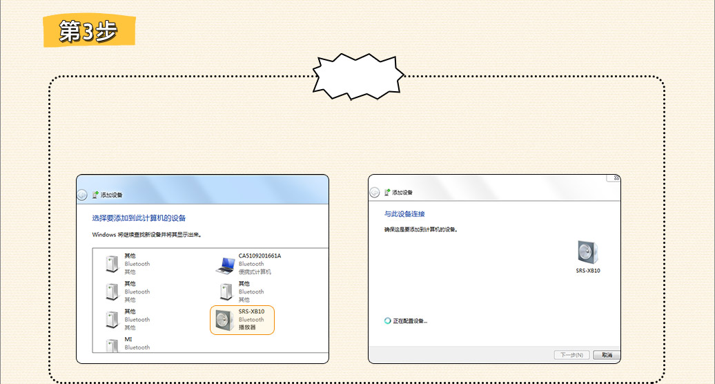 在[设备与打印机]中选择[添加设备],选择 [SRS-XB10]并单击[下一步]。