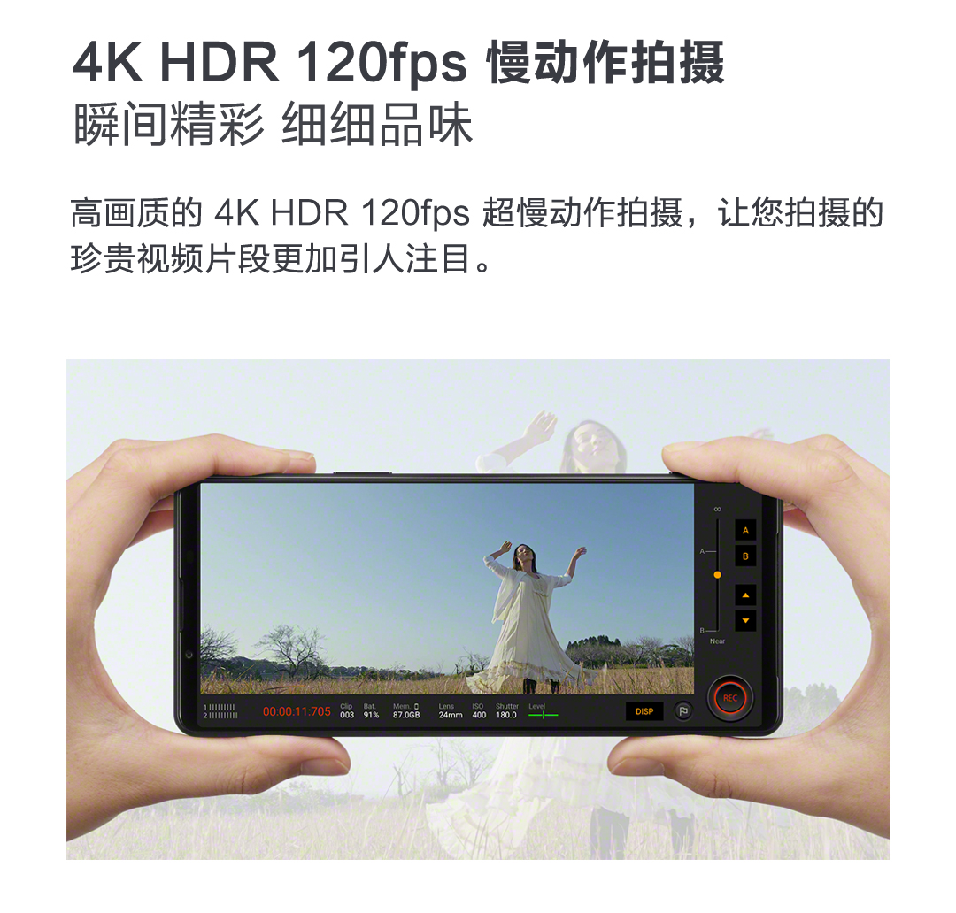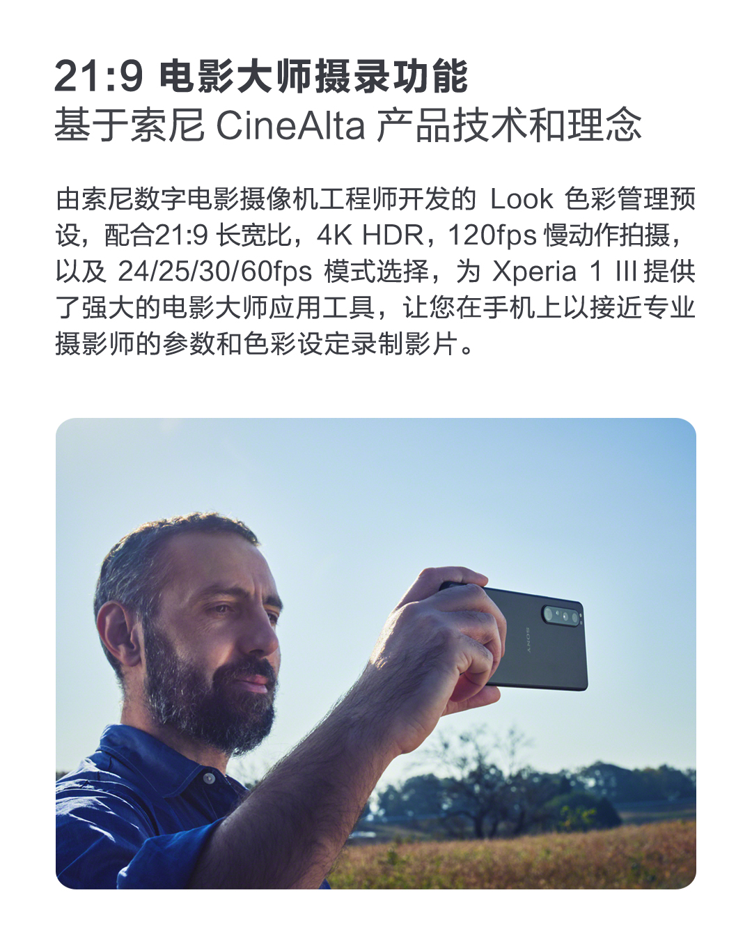 由索尼数字电影摄像机工程师开发的 Look 色彩管理预设,配合 21:9 长宽比,4K HDR,120fps 慢动作拍摄,以及 24/25/30/60fps 模式选择,为 Xperia 1 III 提供了强大的电影大师应用工具,让您在手机上以接近专业摄影师的参数和色彩设定录制影片。