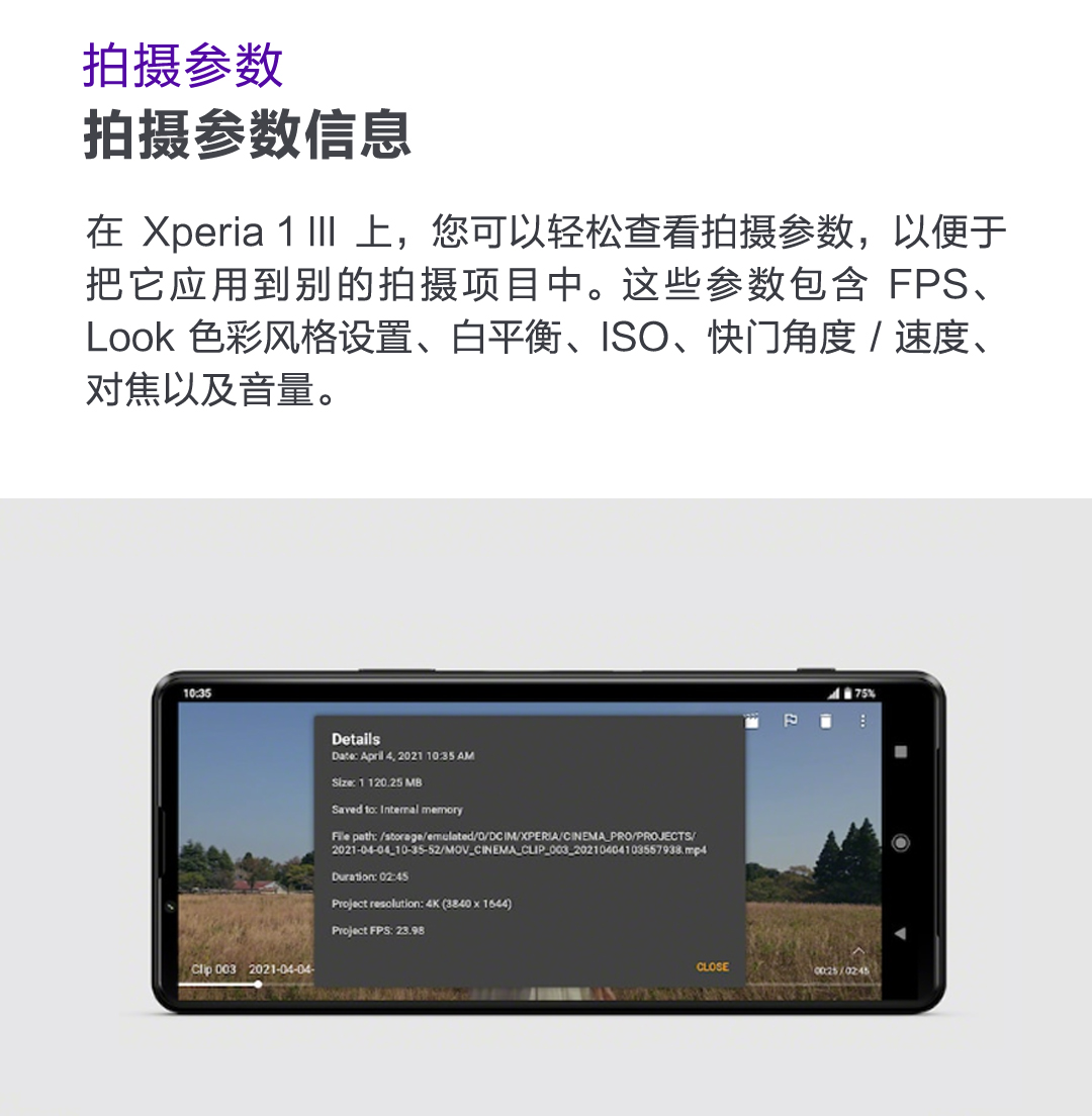 在 Xperia 1 III 上,您可以轻松查看拍摄参数,以便于把它应用到别的拍摄项目中。这些参数包含 FPS、Look 色彩风格设置、白平衡、ISO、快门角度/速度、对焦以及音量。