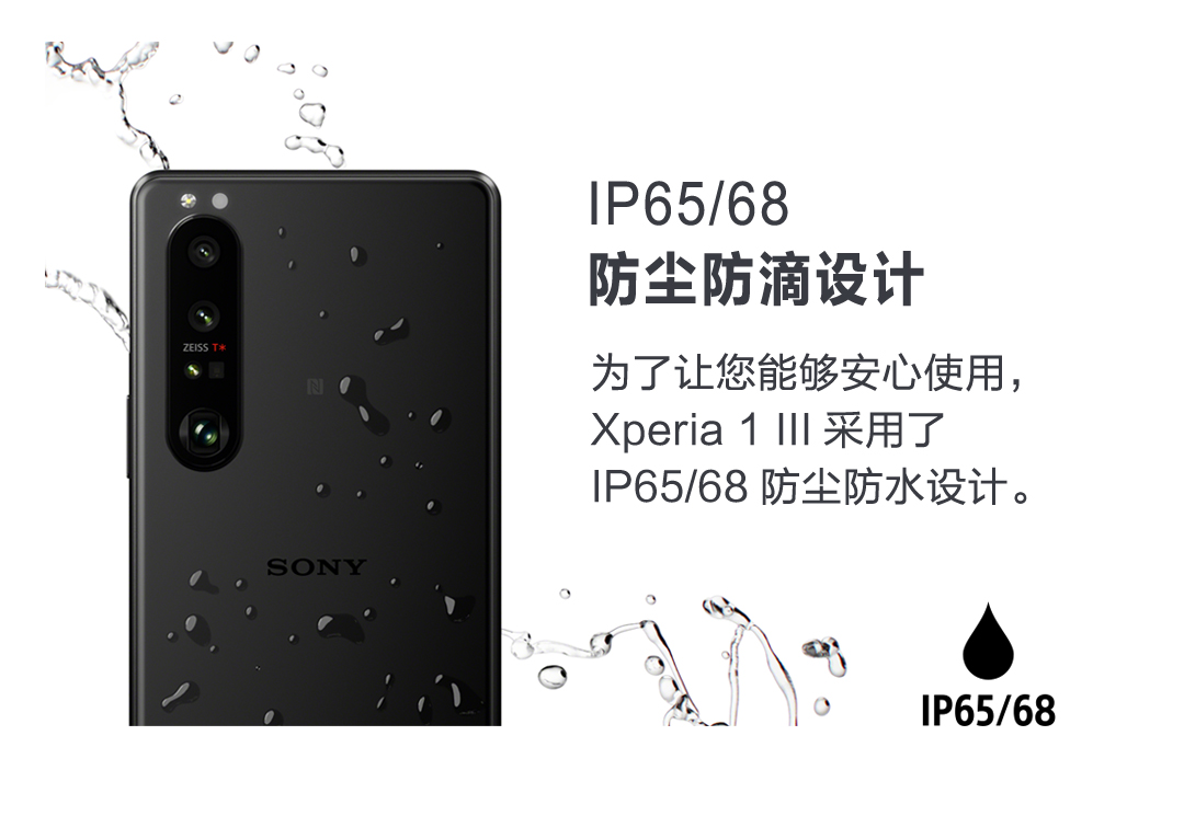 为了让您能够安心使用,Xperia 1 III 采用了 IP65/68 防尘防水设计。