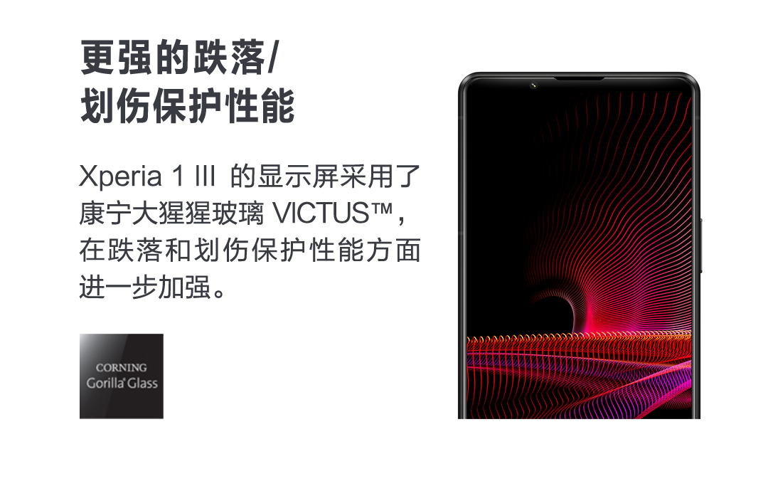 Xperia 1 III 的显示屏采用了康宁大猩猩玻璃 VICTUS™,在跌落和划伤保护性能方面进一步加强。