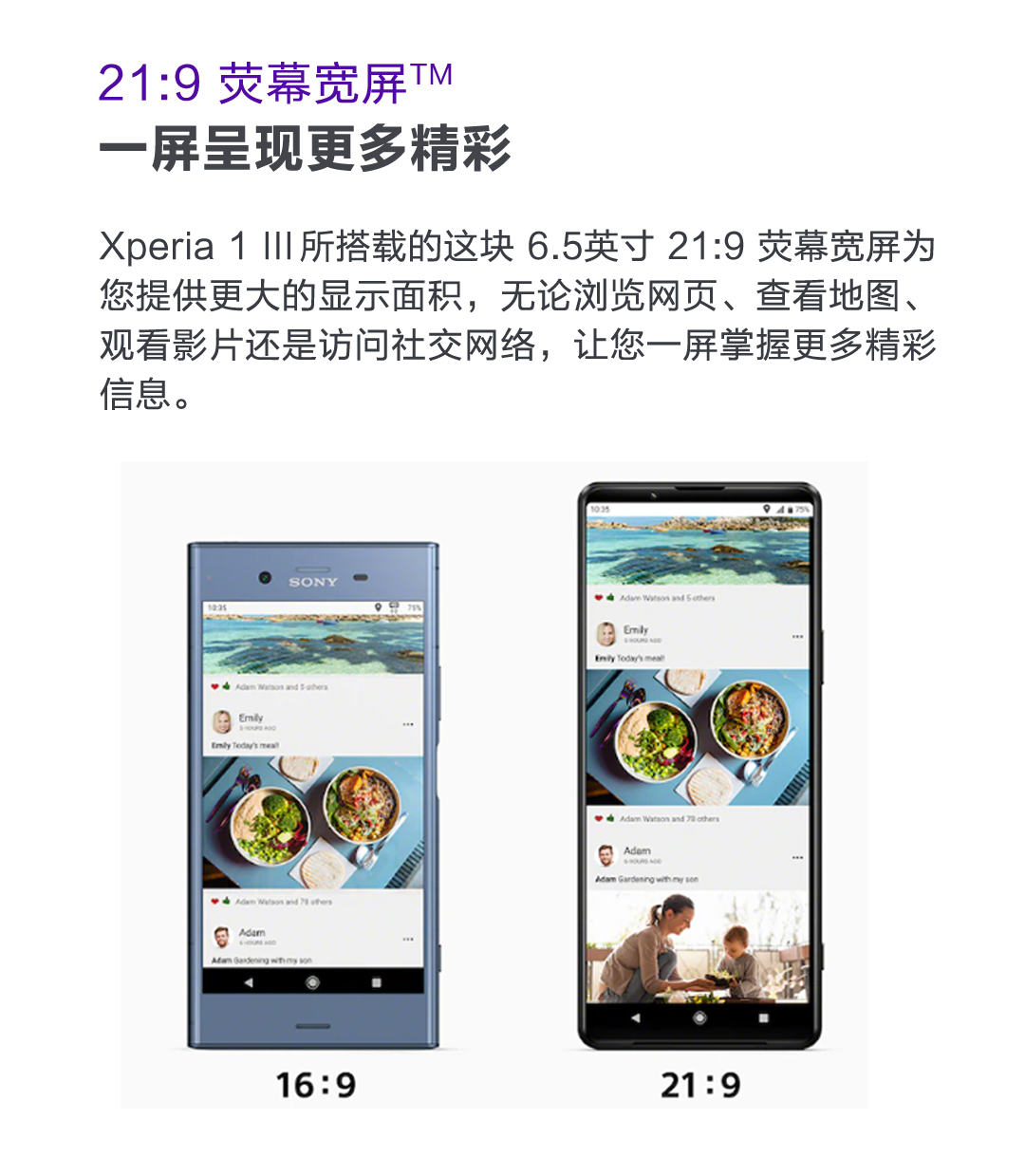 Xperia 1 III 所搭载的这块 6.5 英寸 21:9 荧幕宽屏为您提供更大的显示面积,无论浏览网页、查看地图、观看影片还是访问社交网络,让您一屏掌握更多精彩信息。