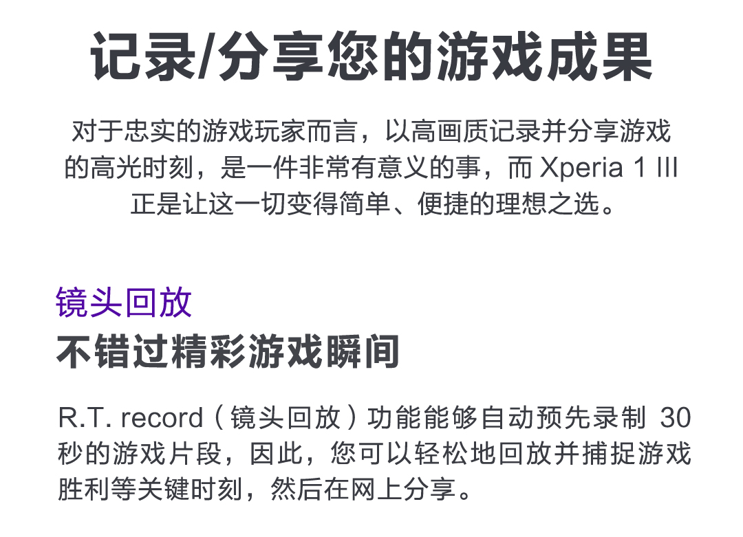 对于忠实的游戏玩家而言,以高画质记录并分享游戏的高光时刻,是一件非常有意义的事,而 Xperia 1 III正是让这一切变得简单、便捷的理想之选。