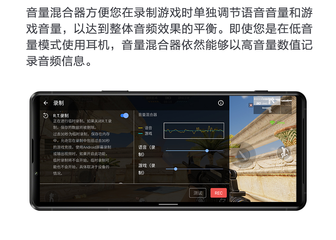 音量混合器方便您在录制游戏时单独调节语音音量和游戏音量,以达到整体音频效果的平衡。即使您是在低音量模式使用耳机,音量混合器依然能够以高音量数值记录音频信息。