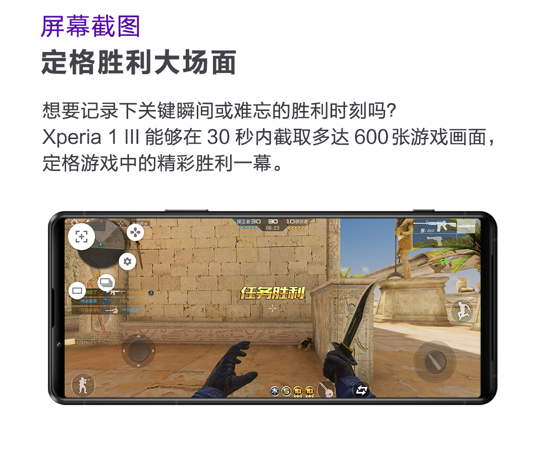 Xperia 1 III 能够在 30 秒内截取多达 600 张游戏画面,定格游戏中的精彩胜利一幕。