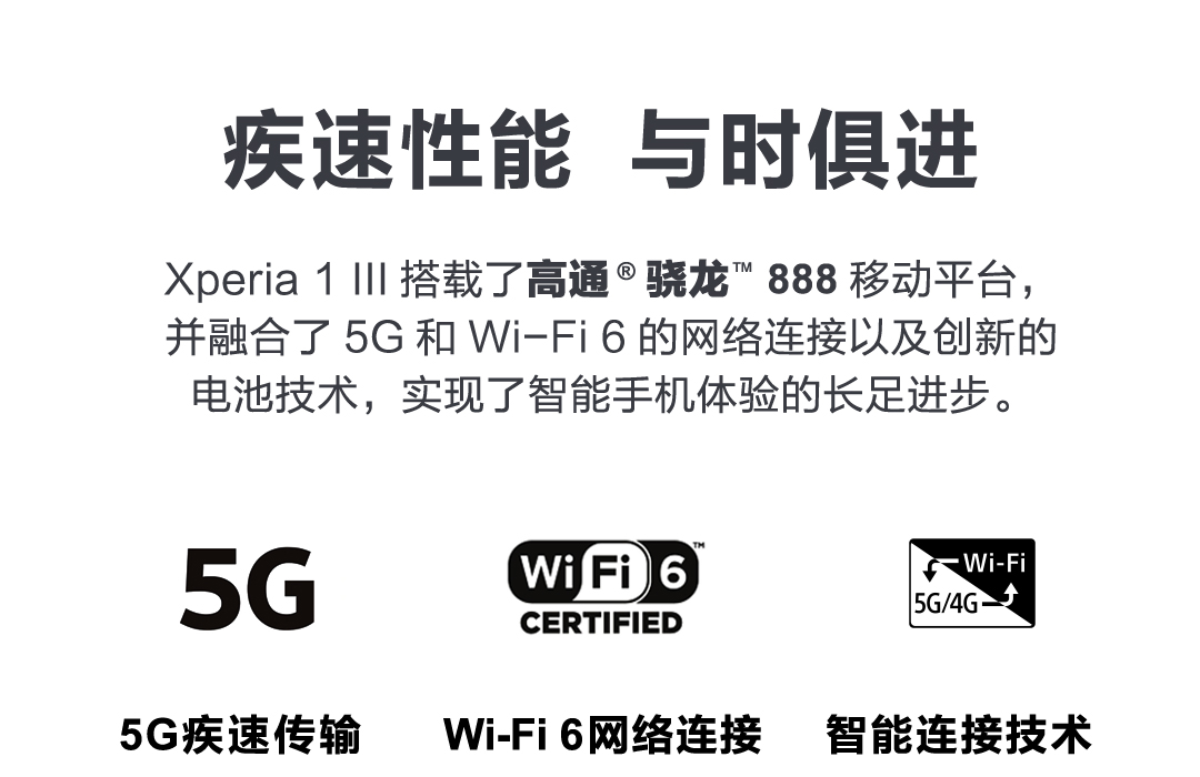 Xperia 1 III 搭载了高通® 骁龙™ 888 移动平台,并融合了 5G 和 Wi-Fi 6 的网络连接以及创新的电池技术,实现了智能手机体验的长足进步。