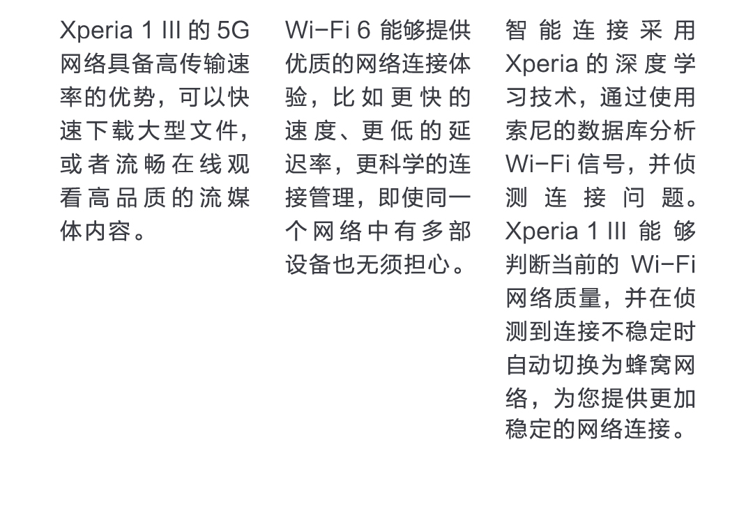 智能连接采用 Xperia 的深度学习技术,通过使用索尼的数据库分析 Wi-Fi 信号,并侦测连接问题。Xperia 1 III 能够判断当前的 Wi-Fi 网络质量,并在侦测到连接不稳定时自动切换为蜂窝网络,为您提供更加稳定的网络连接。