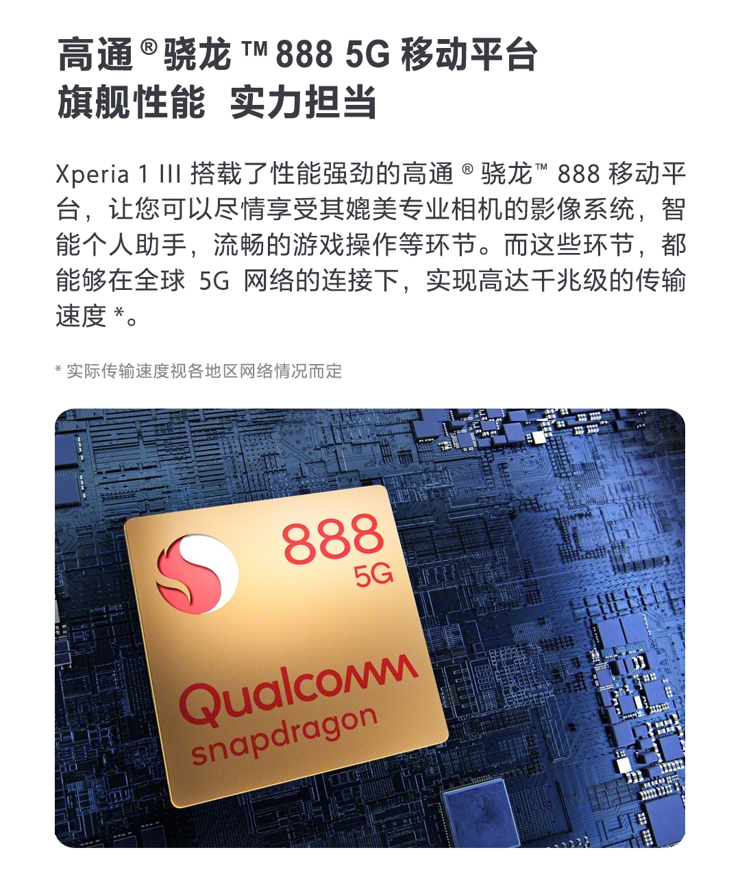 Xperia 1 III 搭载了性能强劲的高通® 骁龙™ 888 移动平台,让您可以尽情享受其媲美专业相机的影像系统,智能个人助手,流畅的游戏操作等环节。而这些环节,都能够在全球5G网络的连接下,实现高达千兆级的传输速度*。